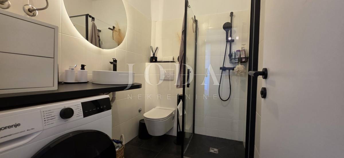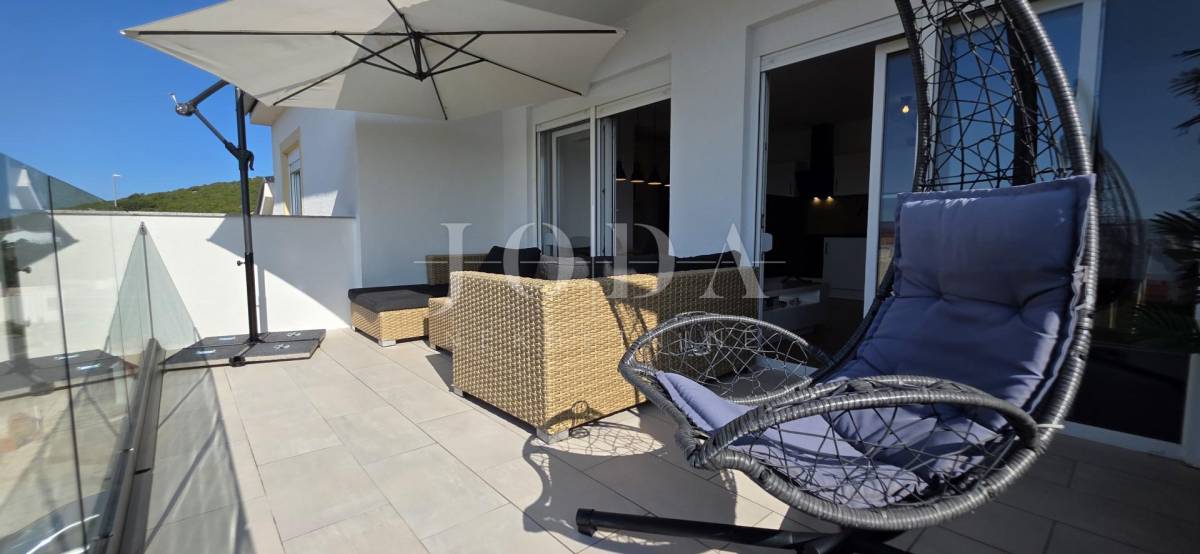 Vanjski prostor nudi veliki balkon sa staklenom ogradom, garniturom za sjedenje, visećom stolicom i suncobranom, a pripadaju mu i dva privatna parkirna mjesta osigurana od neovlaštenog korištenja. Zbog atraktivne lokacije blizu mora i sadržaja, kao i zbog modernog uređenja, stan predstavlja izvrsnu priliku za obiteljsko stanovanje ili kao investicija u turistički najam.
