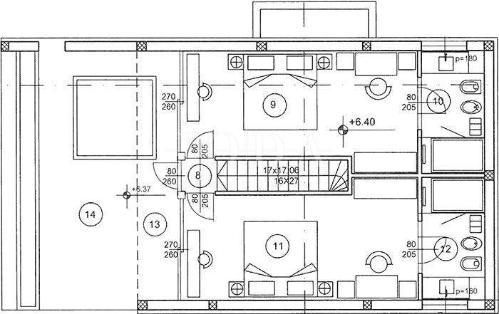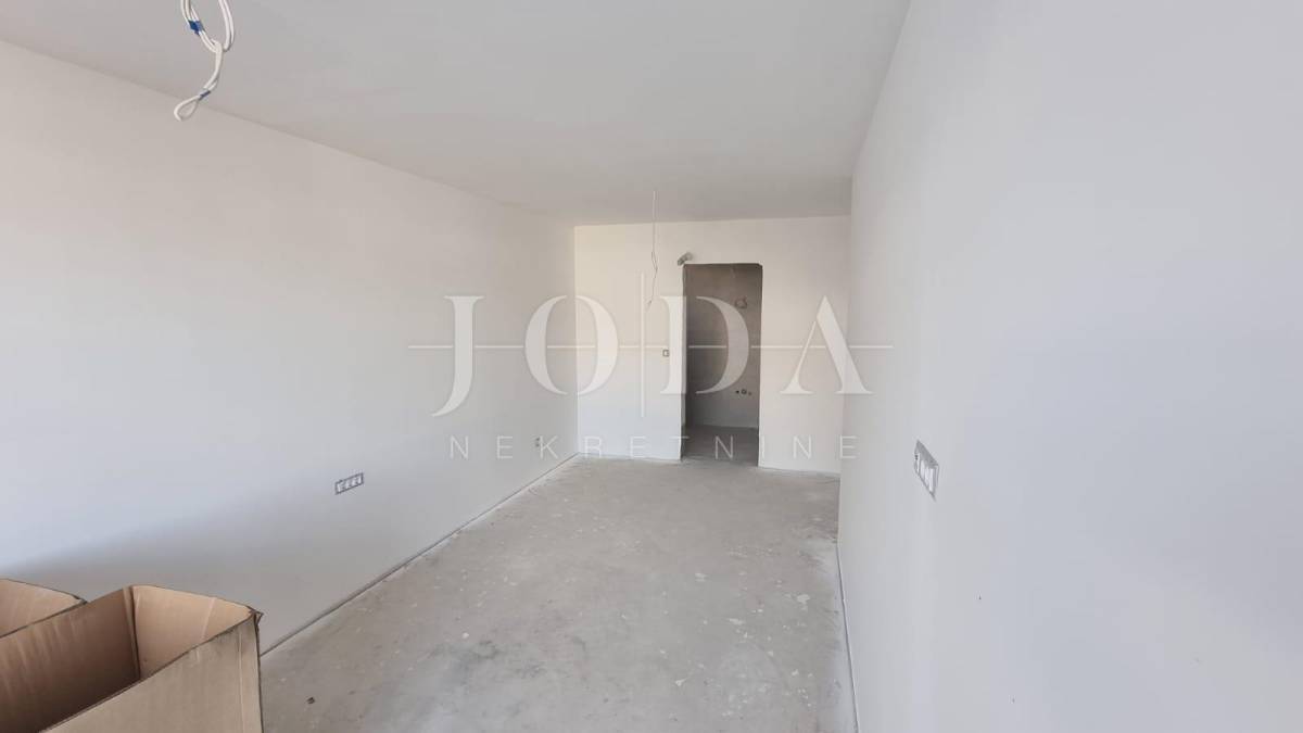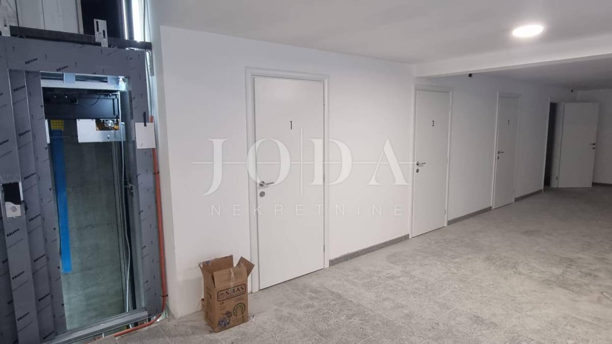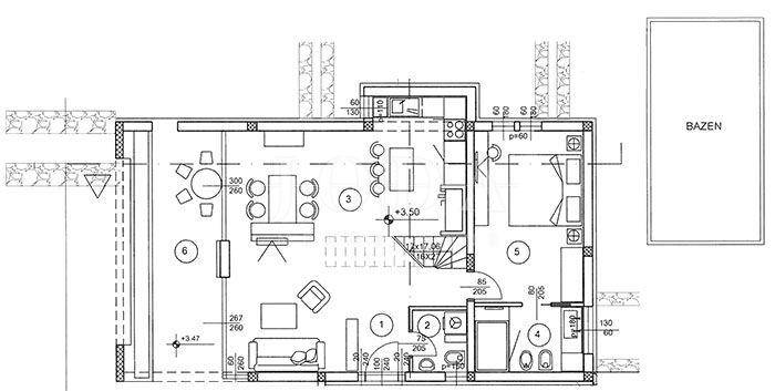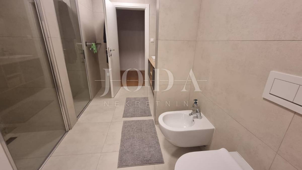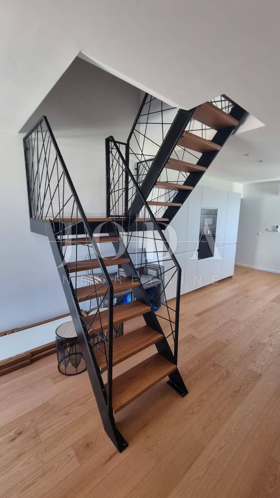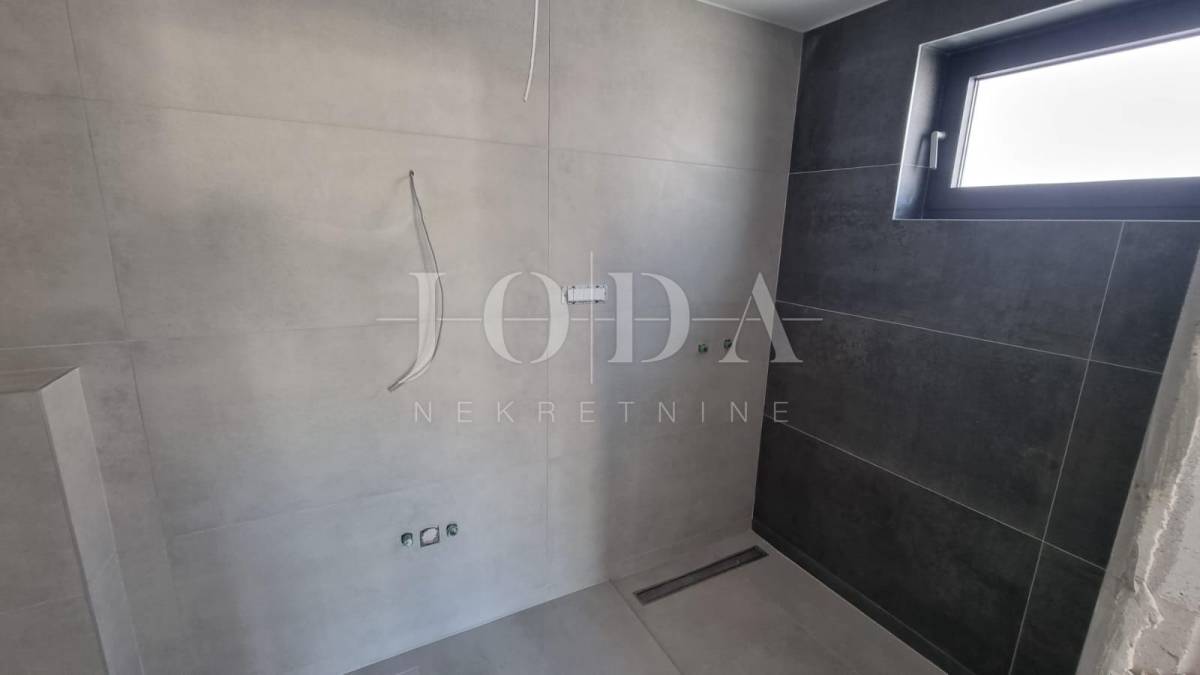 U slobodnostojećoj građevini s ravnim krovom, aluminijskom stolarijom (velikim staklenim stijenama), vrhunskom termoizolacijom, keramikom i drvenim podovima visoke kvalitete u dvoetažni stan površine od oko 100 m2 ulazi se zasebnim ulazom. Potpuna privatnost upotpunjena je privatnim bazenom s dvorištem i vrtom, a prekrasan pogled na more i okolne otoke i planine pruža se sa dvije natkrivene terase. Od centra grada, plaže, restorana i ostalih sadržaja udaljen je oko deset minutaja udaljen je oko deset minuta.