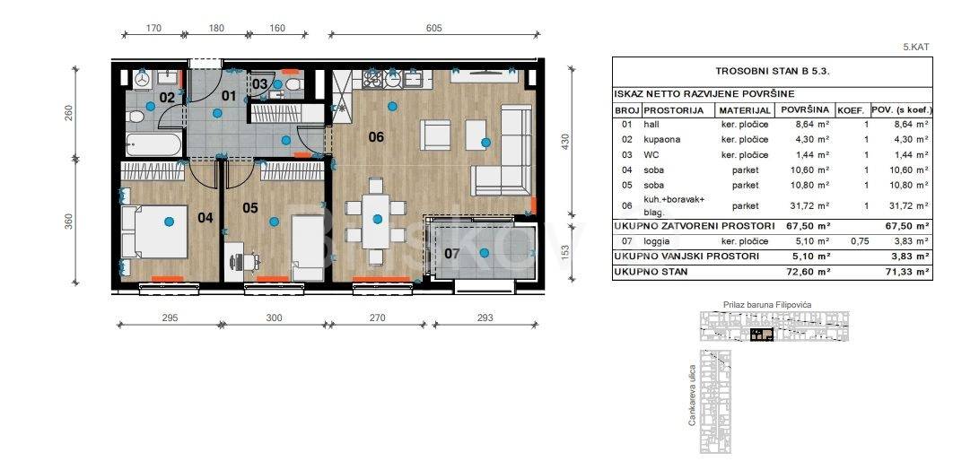 Trosoban stan površine 71,33m2 NKP na 5. katu zgrade u izgradnji. Planirani rok završetka izgradnje je proljeće 2024. godine.