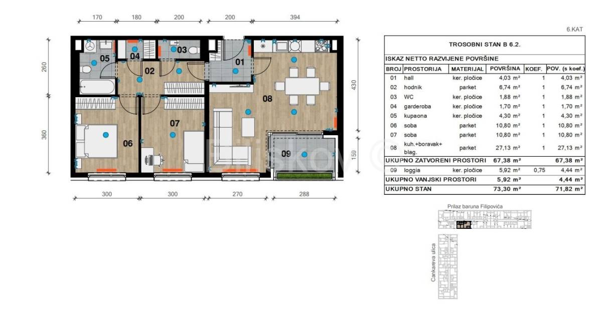 Trosoban stan površine 71,82m2 NKP na 6. katu zgrade u izgradnji. Planirani rok završetka izgradnje je proljeće 2024. godine.