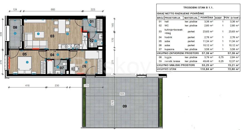 Luksuzan trosoban stan ukupne NKP 72,60 m2 na 1.katu novogradnje.