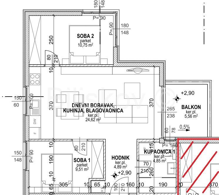 Sastoji se od ulaznog hodnika, dnevnog boravka, kuhinje i blagovaonice u open-space konceptu, dvije spavaće sobe, kupaonice i natkrivene terase.