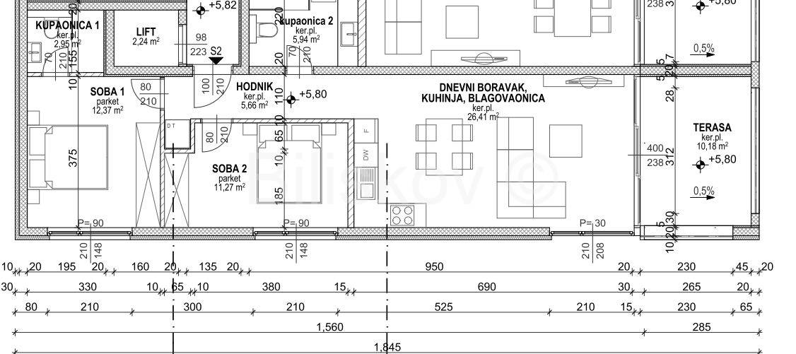 Sastoji se od ulaznog hodnika, dnevnog boravka, kuhinje i blagovaonice u open-space konceptu, dvije spavaće sobe od kojih jedna ima vlastitu kupaonicu, dodatne kupaonice i natkrivene terase.