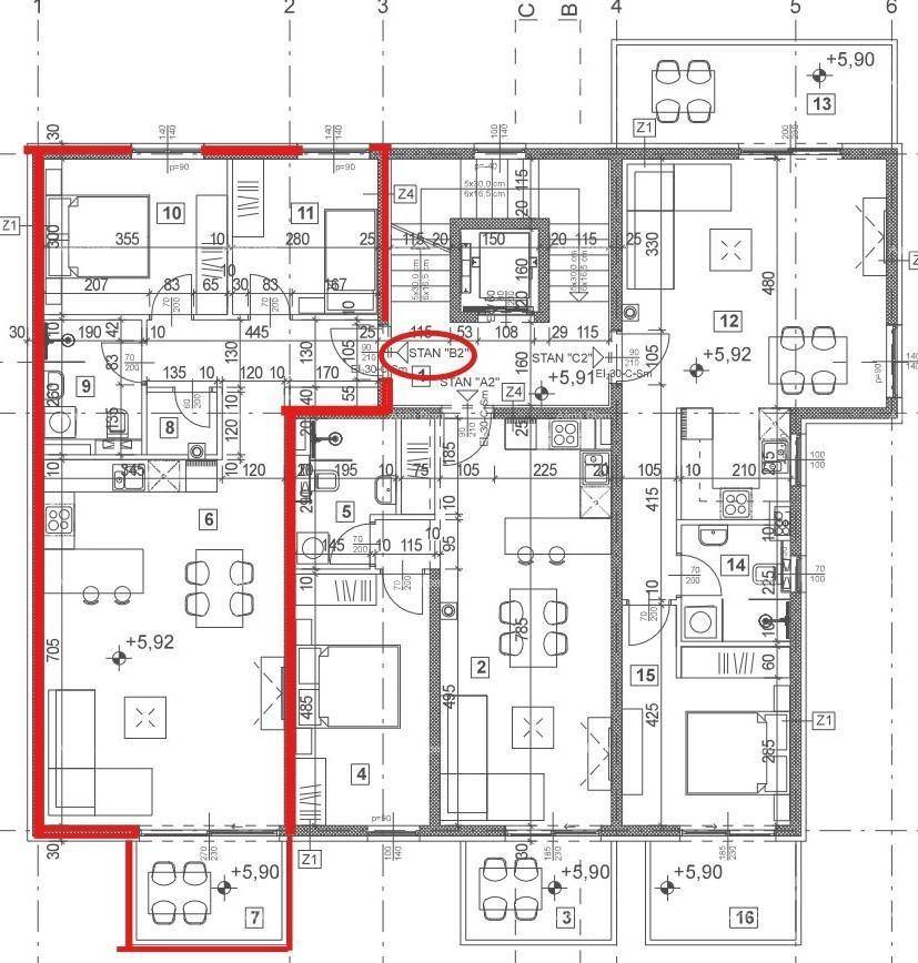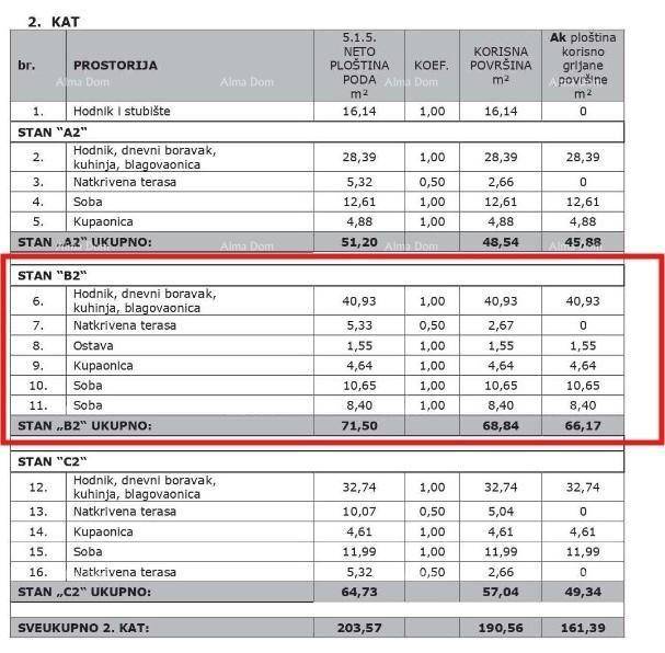Stan B2, površine 71.50 m2 (neto korisne površine 68.84 m2) sastoji se od kuhinje s dnevnim boravkom i blagavaonom, 2 spavaće sobe, kupaone, ostave i natkrivene terase.
