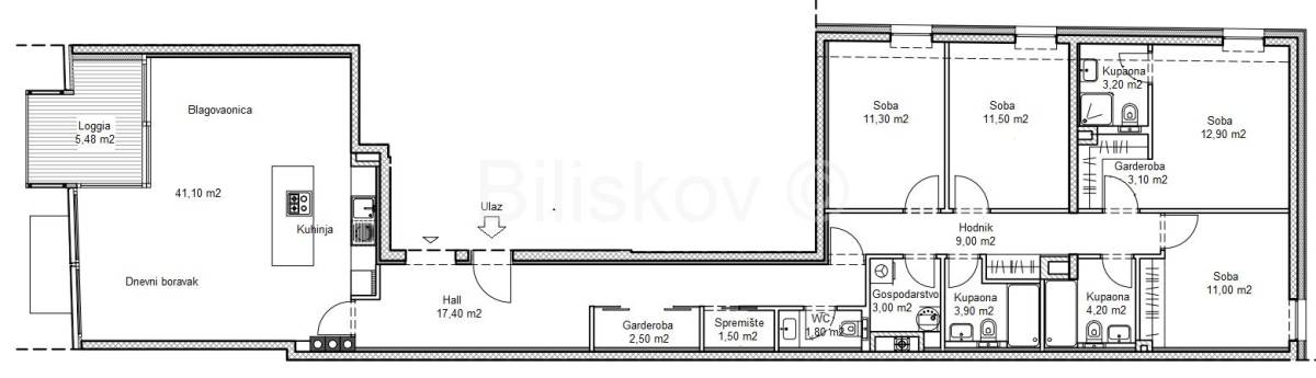 Stan se sastoji od velikog dnevnog boravka integriranog s kuhinjom i blagovaonicom, te izlazom na loggiu, tri manje spavaće sobe, roditeljske spavaće sobe sa kupaonicom i garderobom, dodatne dvije kupaonice, spremišta, garderobe, gospodarstva i halla.