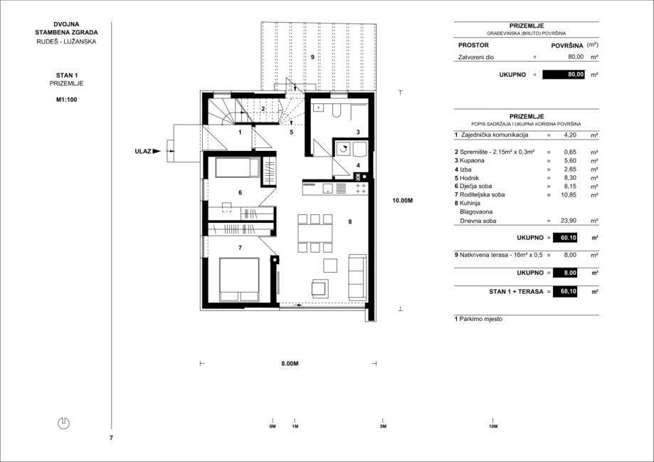 NOVOGRADNJA 2024.g.-Rudeš/Lužanska ulica: trosobni stan u prizemlju NKP 60.10m2 s natkrivenom terasom NKP 8.00m2, parkirnim mjestom NKP 2.6m2, te vrtom NKP 0.90m2 i spremištem u vrtu NKP 1.15m2, sveukupno NKP 72.60m2.