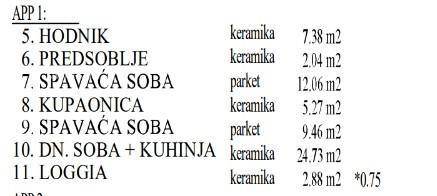 Stan, ukupne površine 64, nalazi se u prizemlju zgrade i sastoji se od: ulaznog hodnika i predsoblja, dnevnog boravka sa kuhinjom i blagavaonom, 2 spavaće sobe, kupaone i loggia-e. Stanu također pripada i manji vrt.
