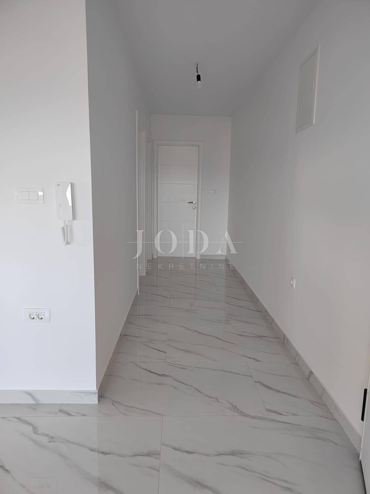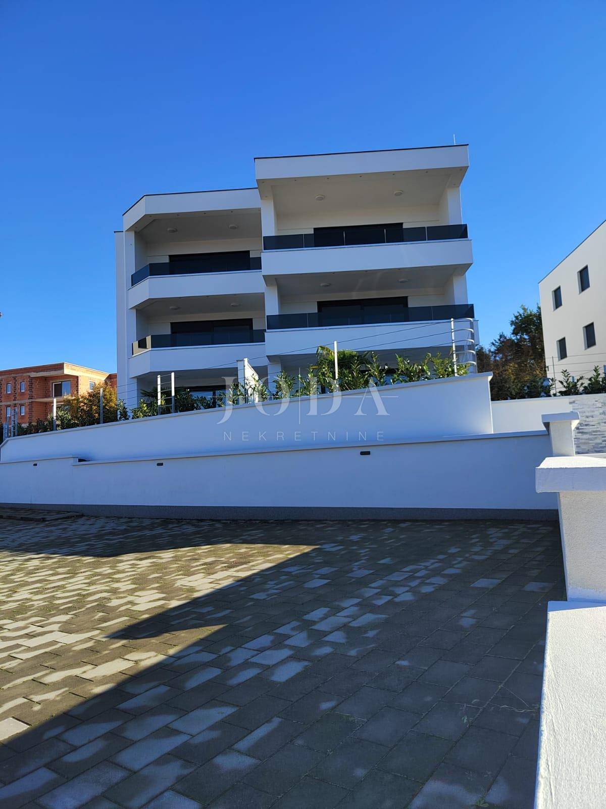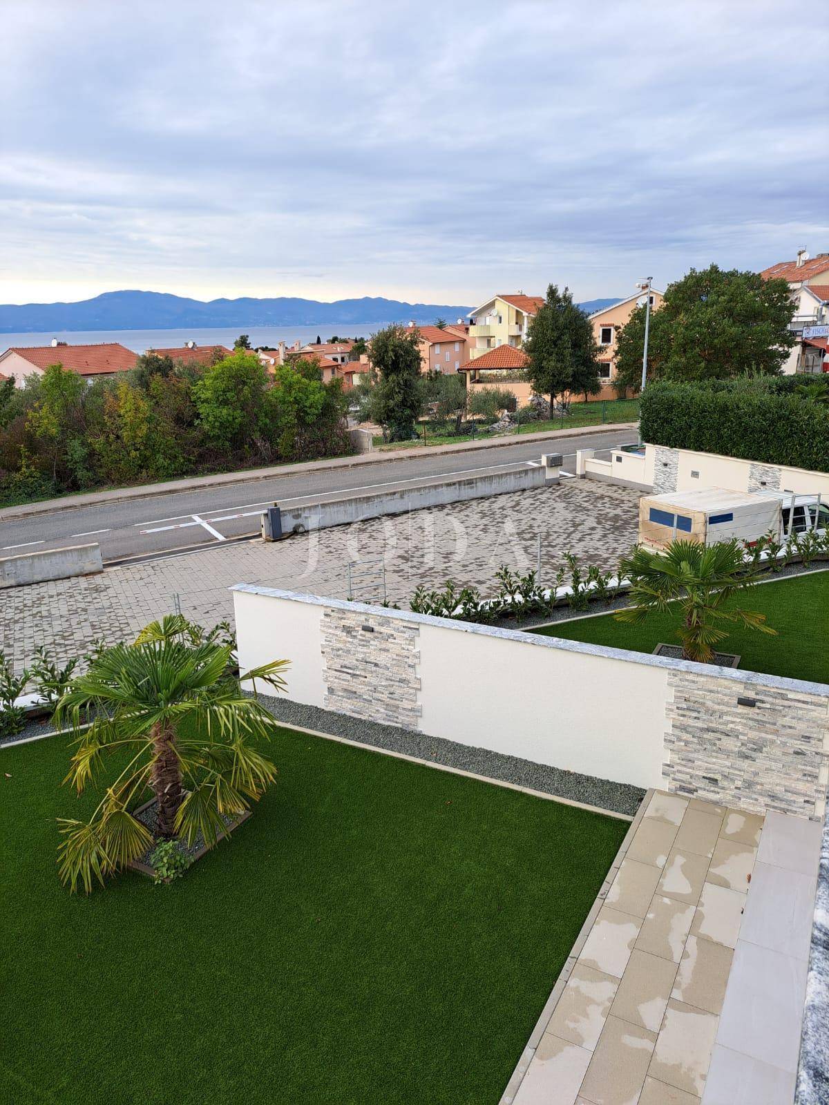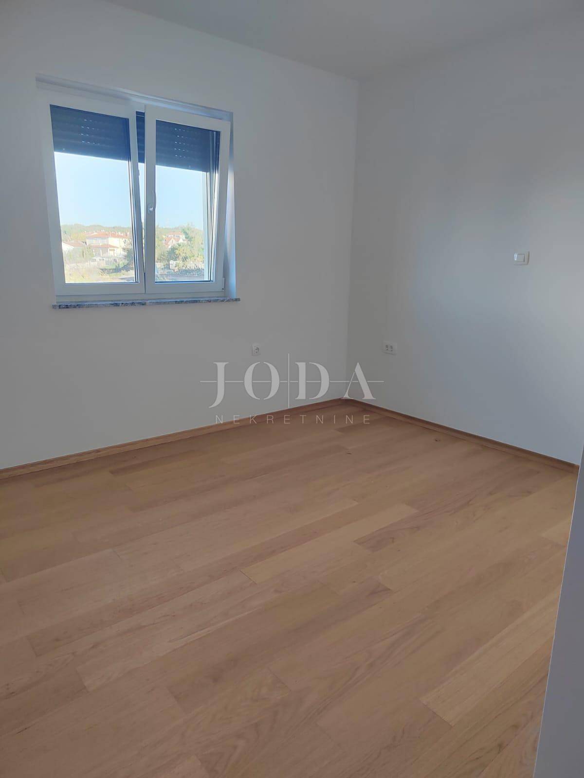 Apartman se nalazi na prvom katu. Stambena površina iznosi 72m2, a sastoji se od ulaznog prostora, dnevnog boravka, kuhinje i blagavaonice, kupaonice, dvije spavaće sobe te izlaza na natkrivenu terasu s prekrasnim pogledom na more. Apartmanu pripada prostor u prizemlju, iste kvadrature i rasporeda. Nekretnini pripada i 125m2 okućnice te dva parkirna mjesta. U izgradnji su korišteni najkvalitetniji materijali kao što su keramičke podne obloge, staklene stijene i PVC stolarija. Useljenje je predviđeno za veljaču 2023. godine.