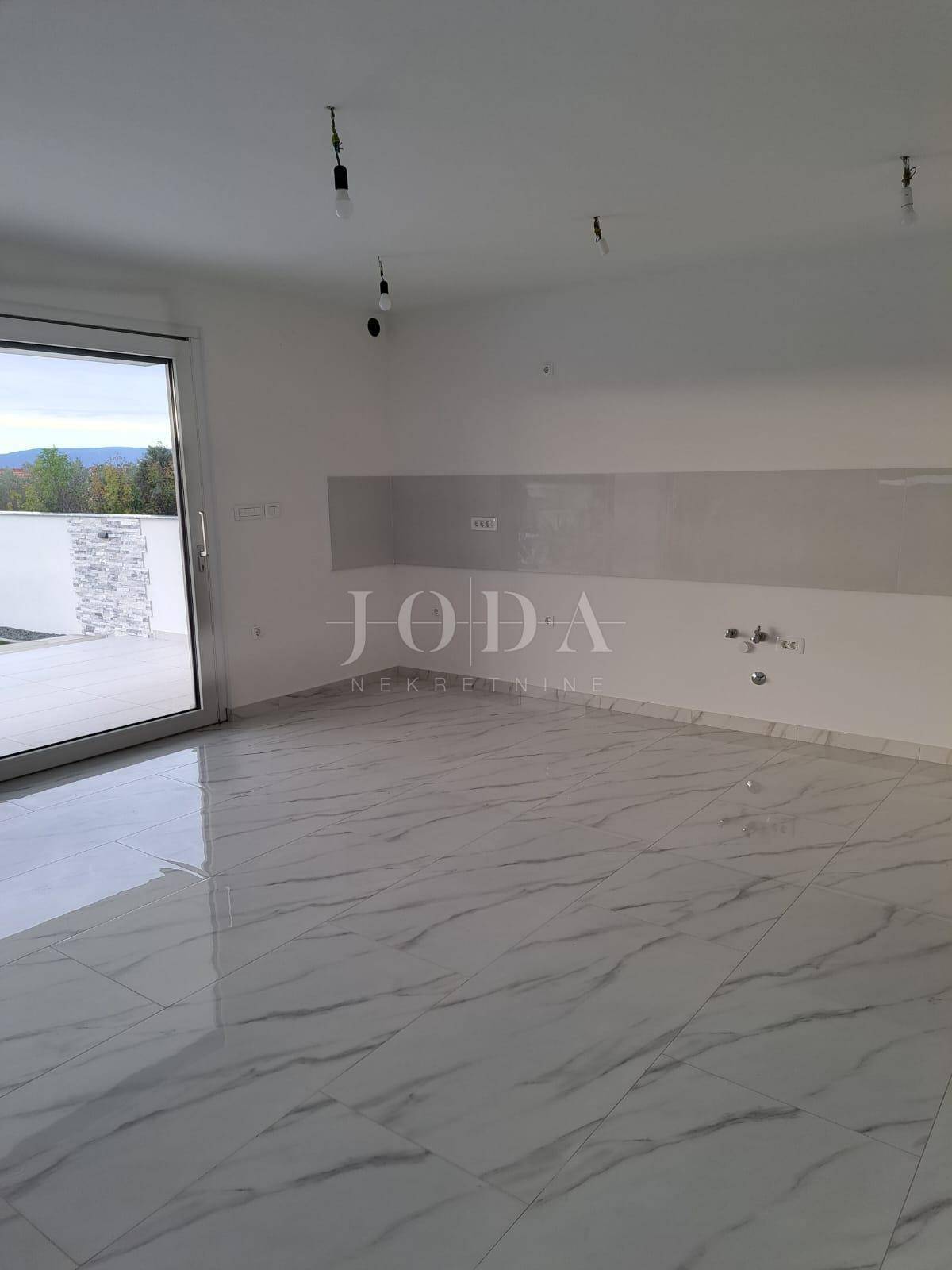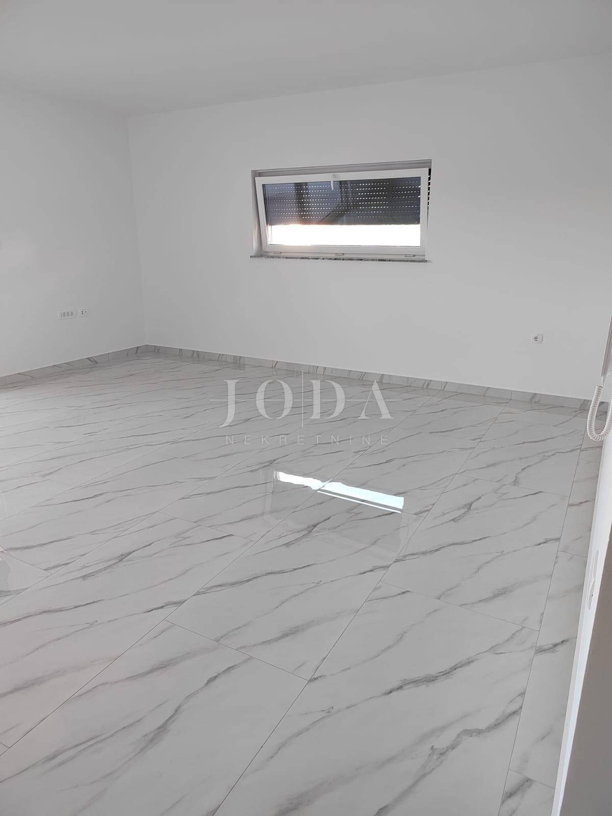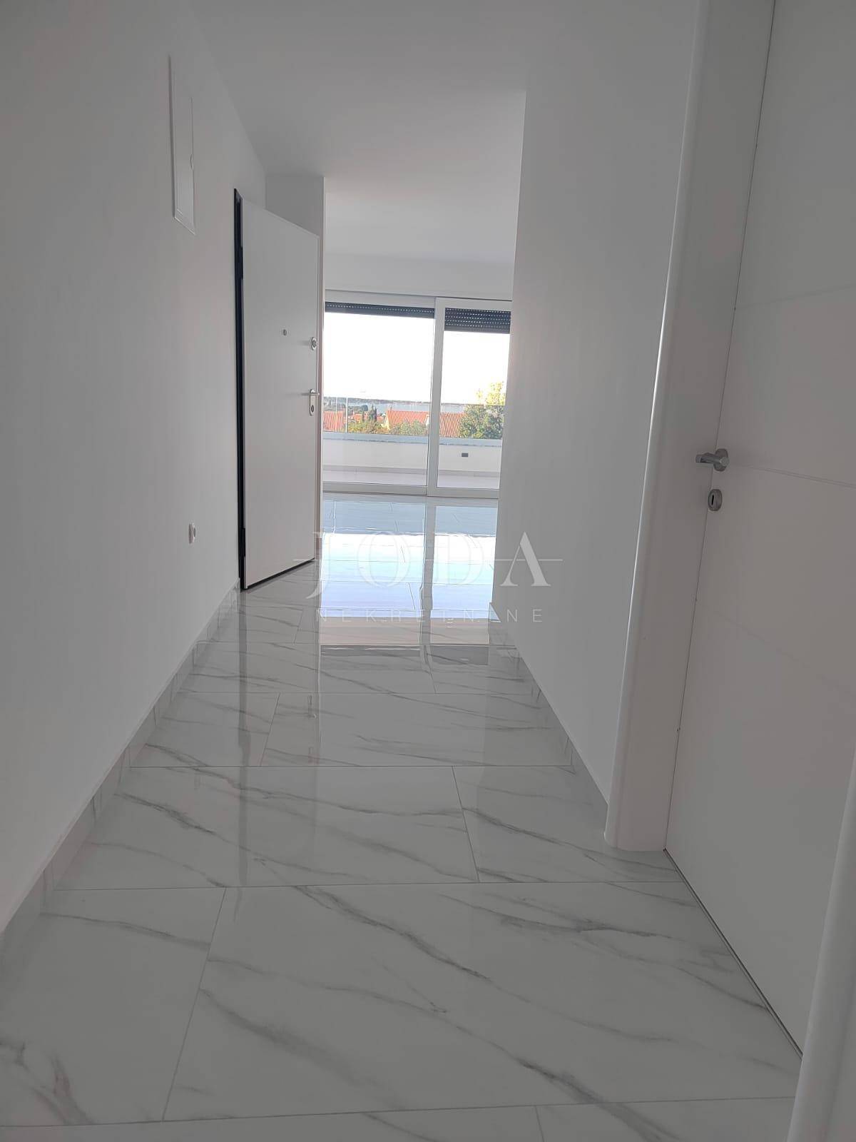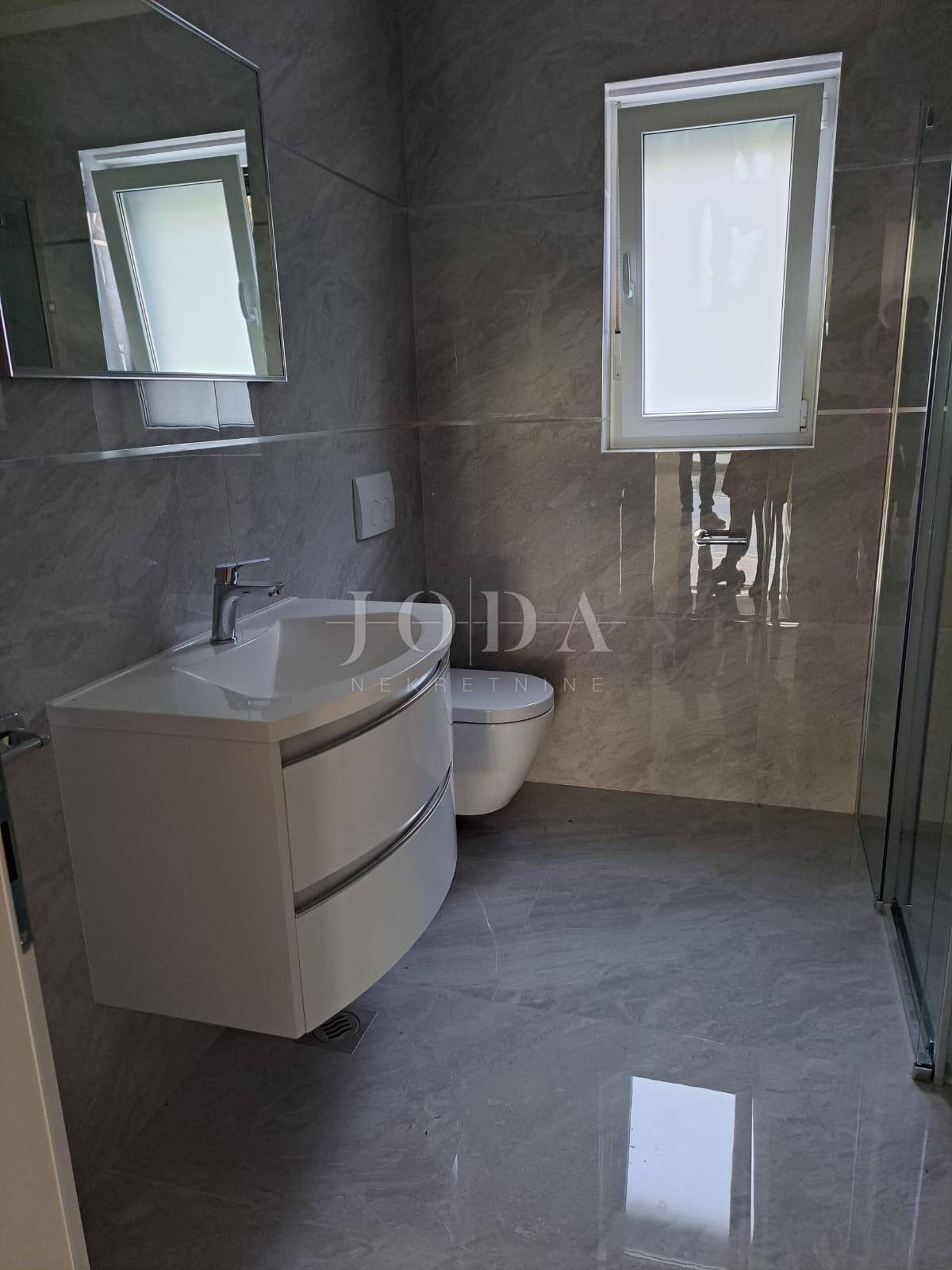 Apartman se nalazi na prvom katu. Stambena površina iznosi 72m2, a sastoji se od ulaznog prostora, dnevnog boravka, kuhinje i blagavaonice, kupaonice, dvije spavaće sobe te izlaza na natkrivenu terasu s prekrasnim pogledom na more. Apartmanu pripada prostor u prizemlju, iste kvadrature i rasporeda. Nekretnini pripada i 125m2 okućnice te dva parkirna mjesta. U izgradnji su korišteni najkvalitetniji materijali kao što su keramičke podne obloge, staklene stijene i PVC stolarija. Useljenje je predviđeno za veljaču 2023. godine.