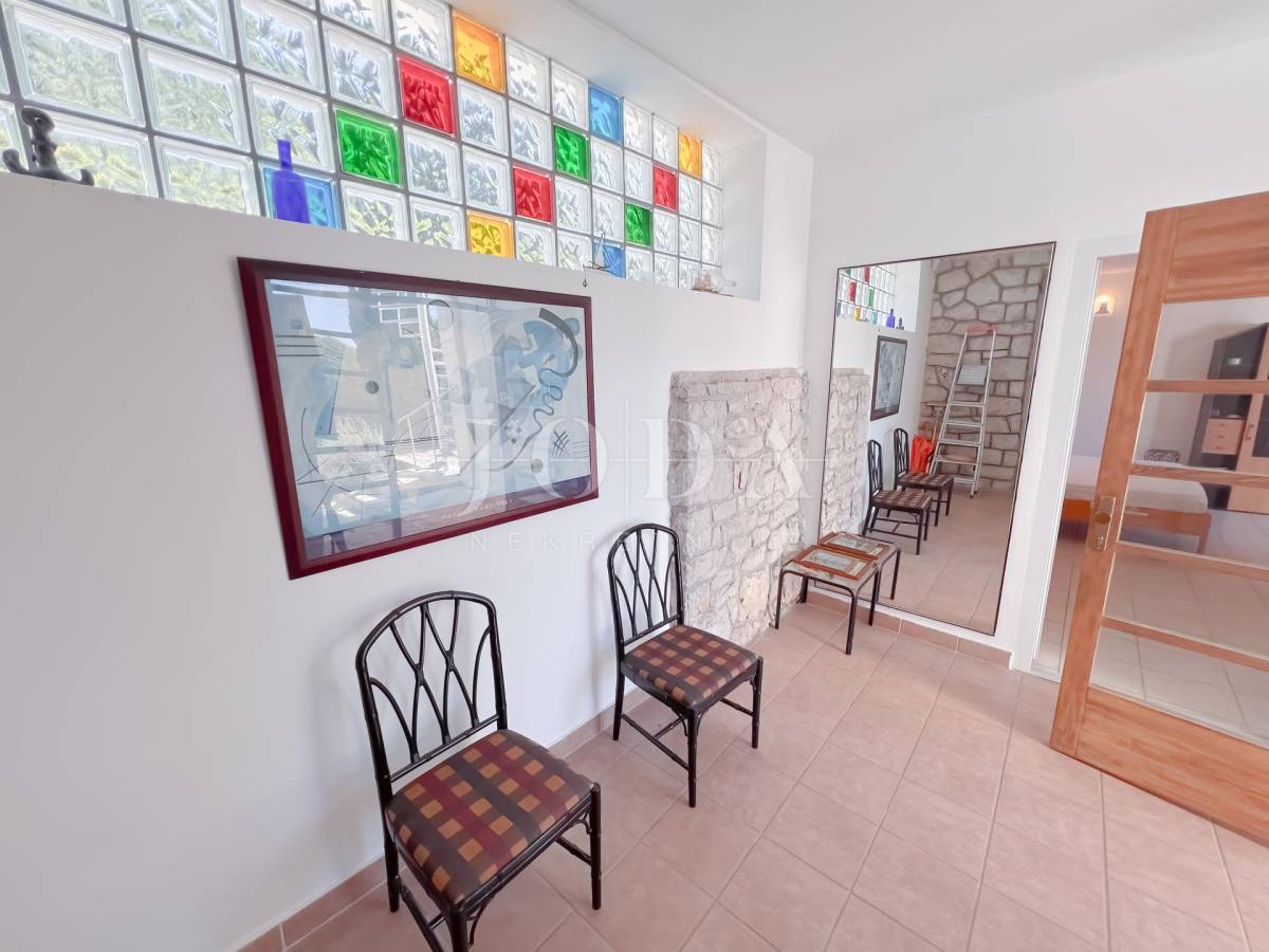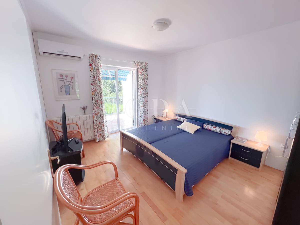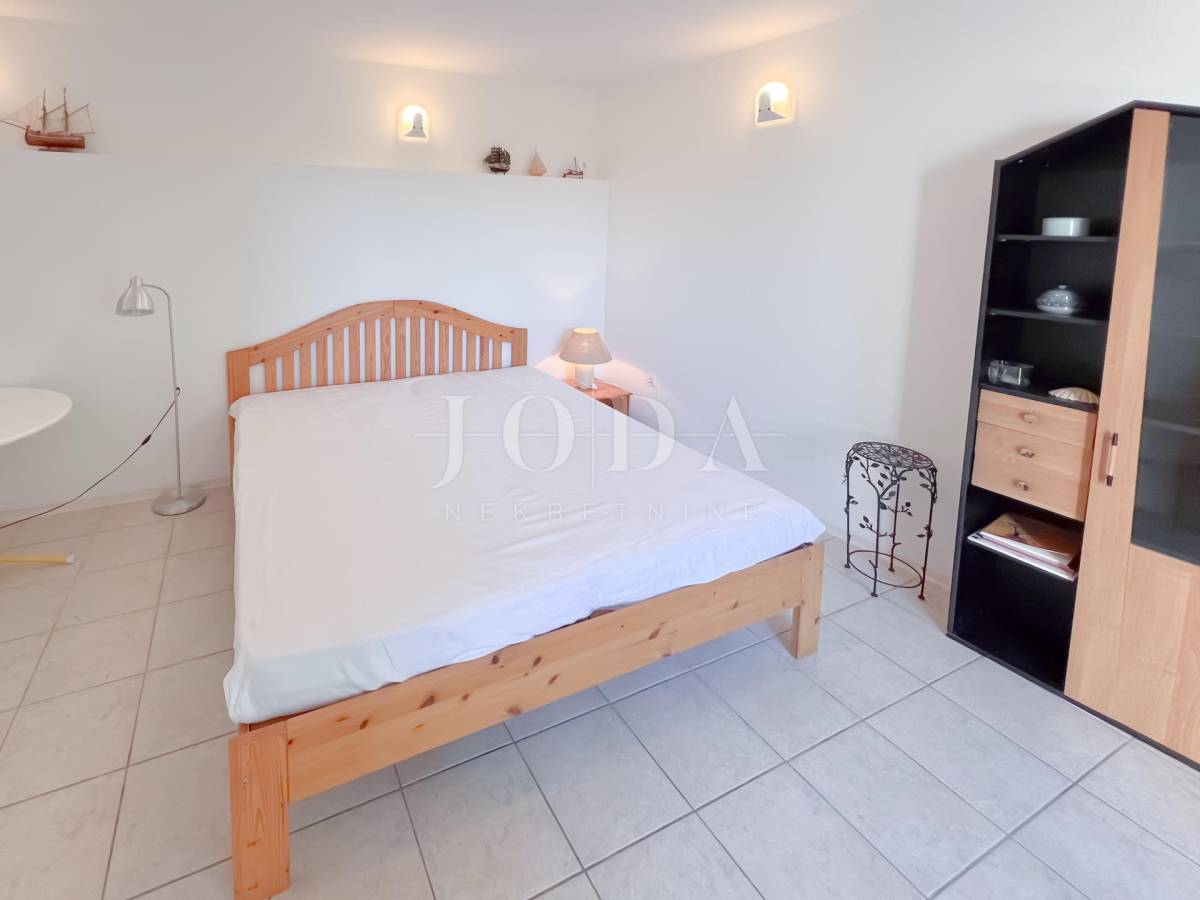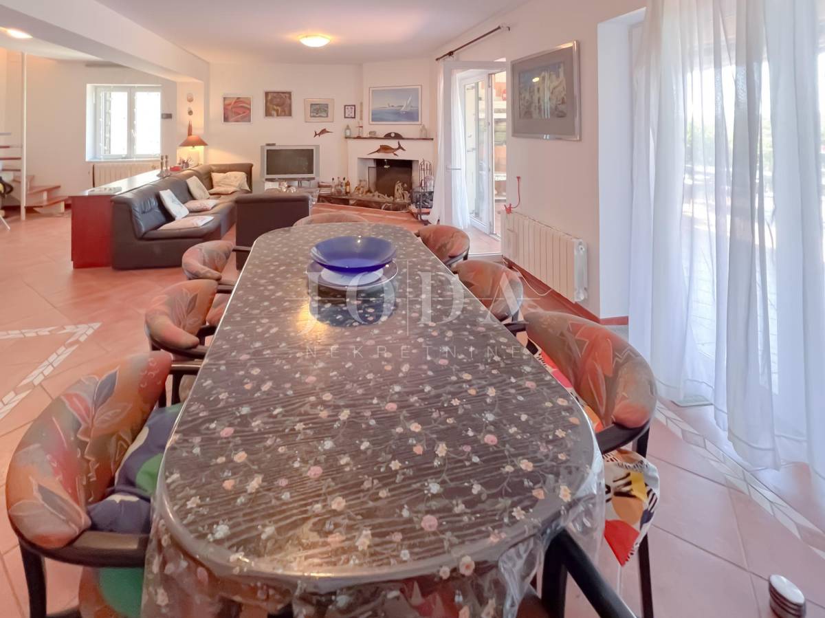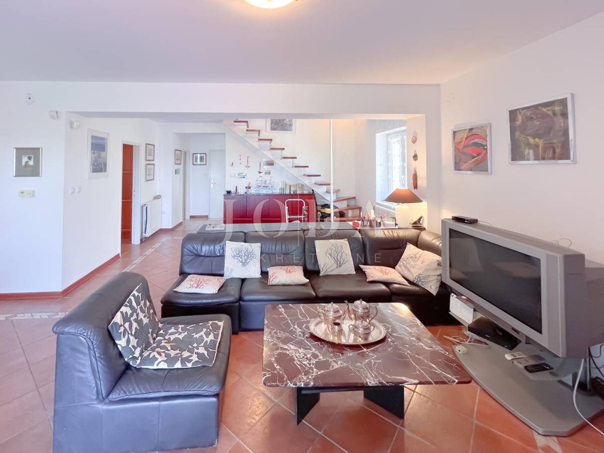 Unutarrnje stubište vodi na kat gdje su četiri spavaće sobe te kupaonica.Svaka etaža ima velike natkrivene terase sa pogledom na more.