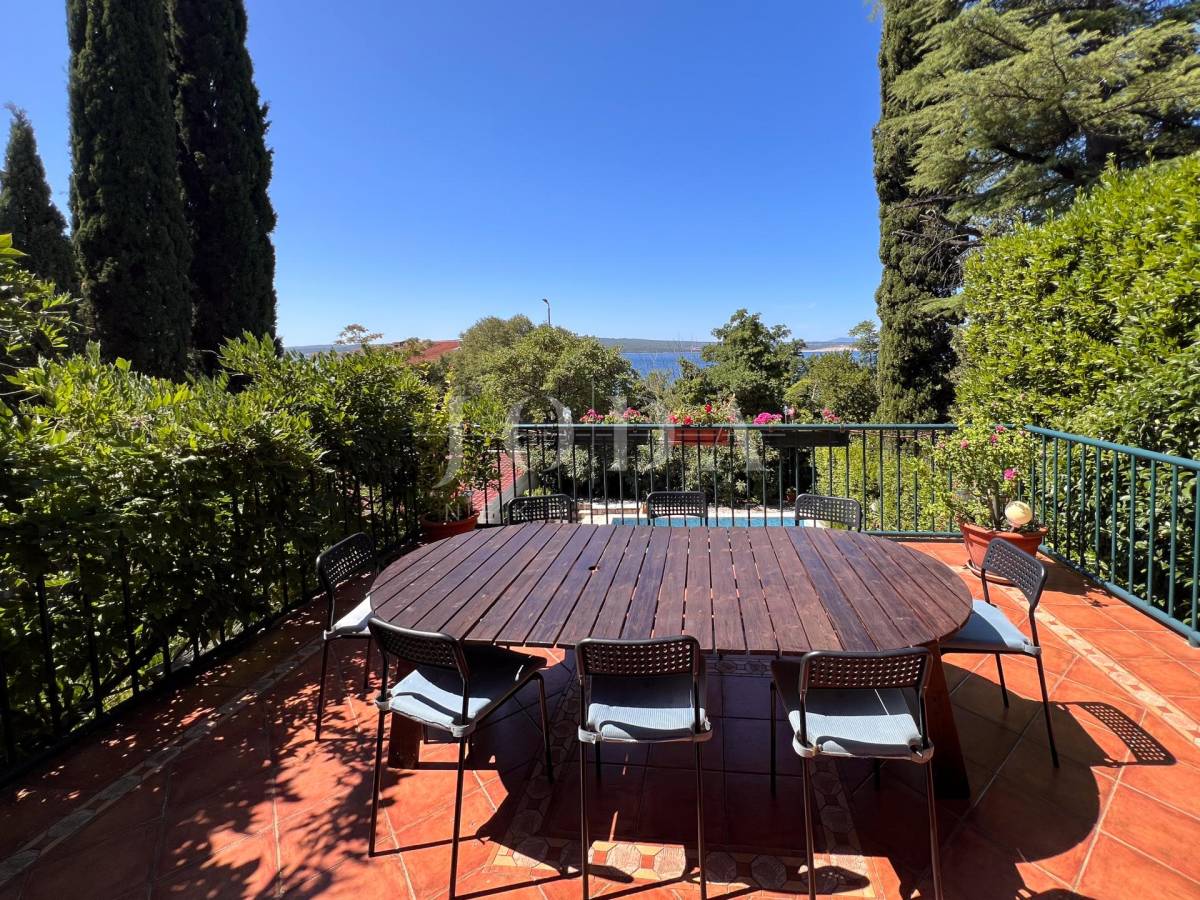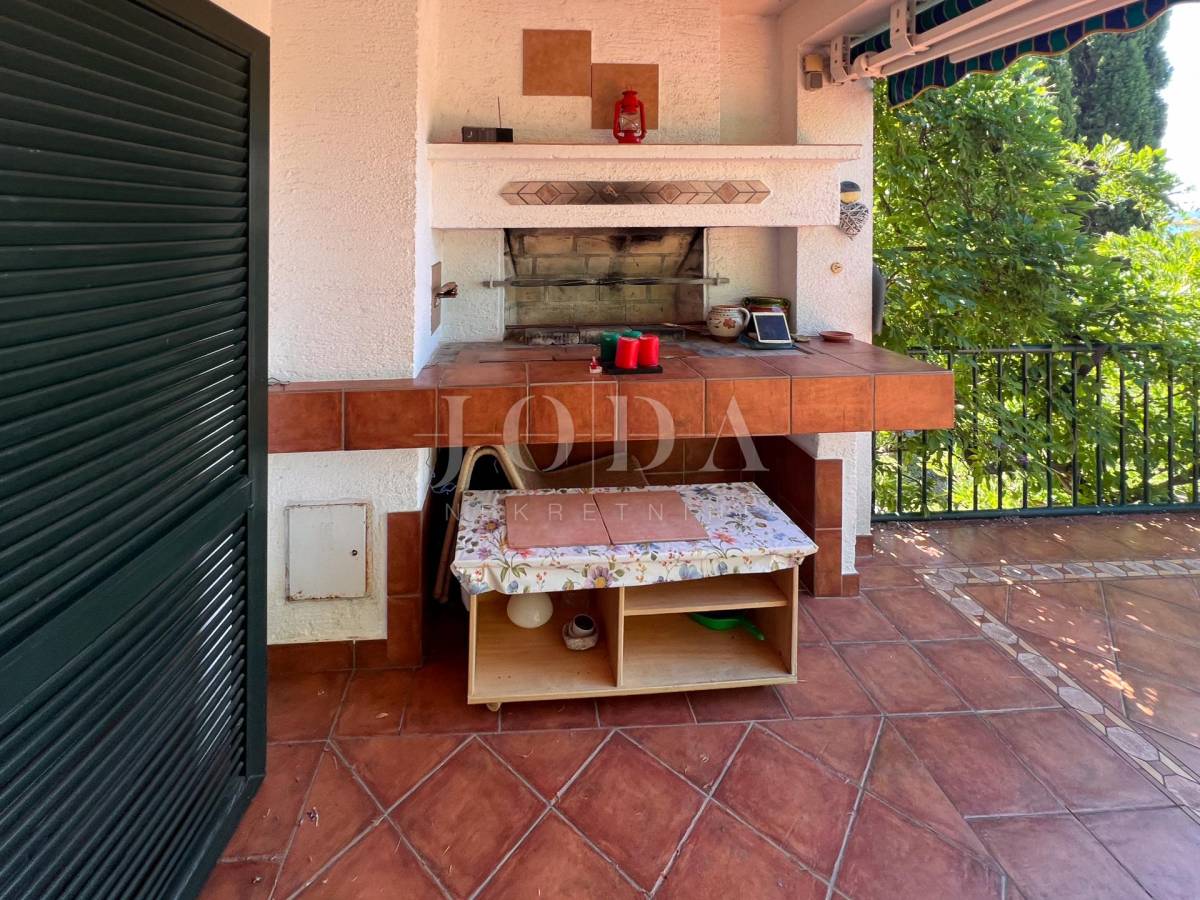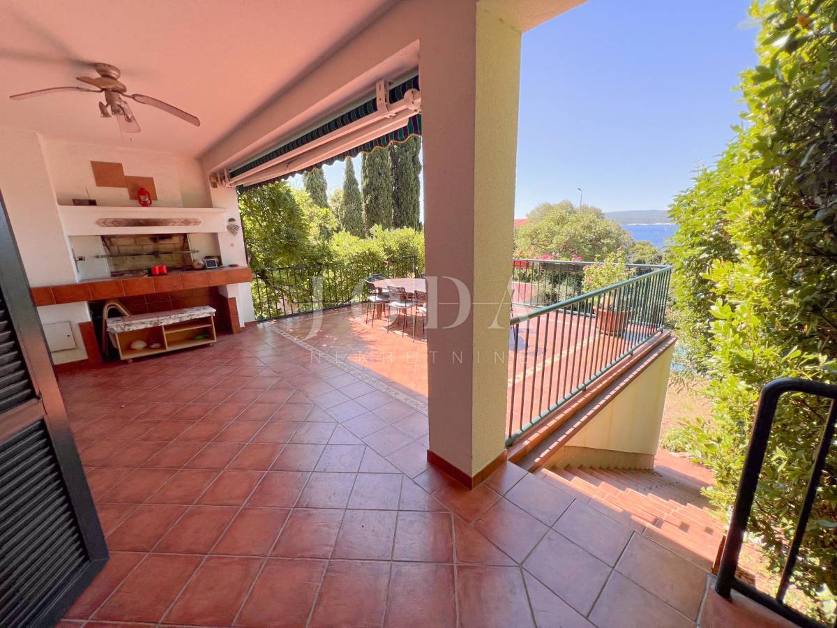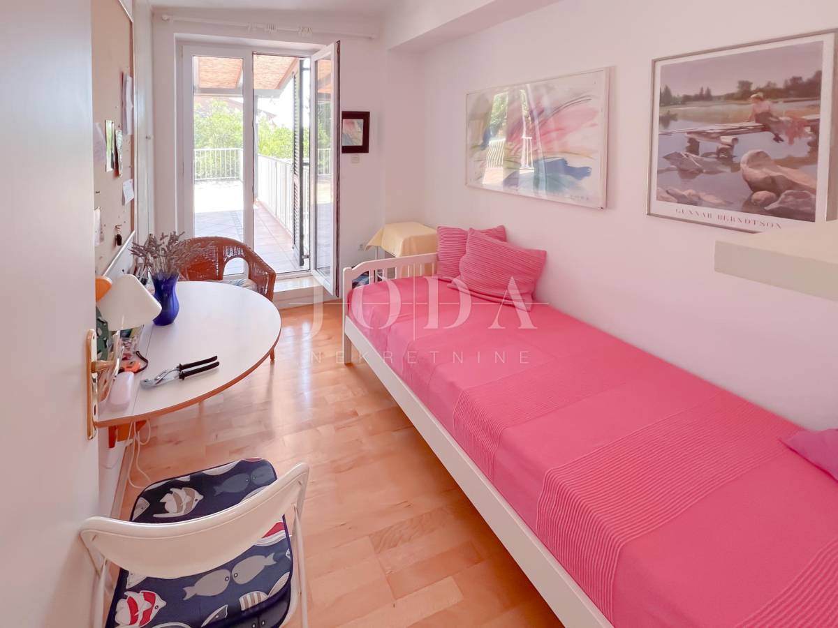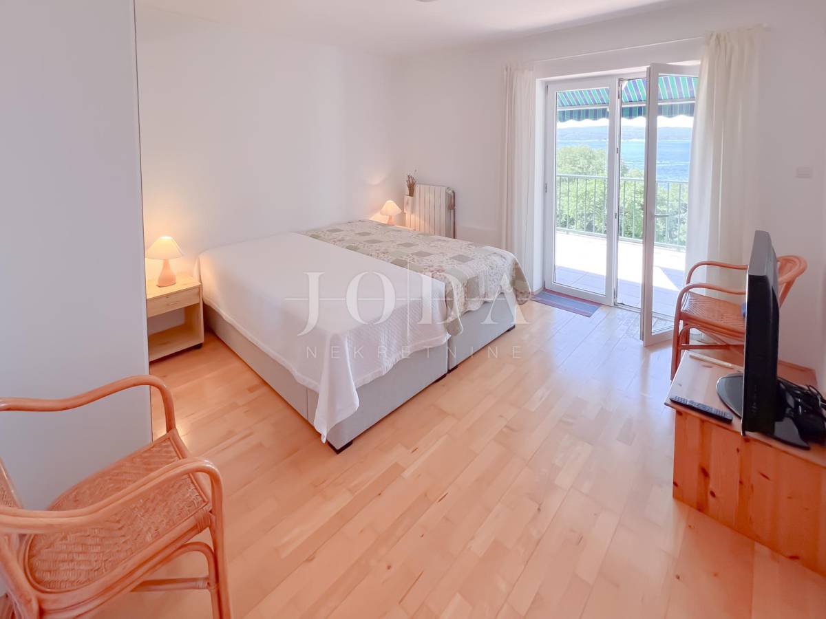 Unutarrnje stubište vodi na kat gdje su četiri spavaće sobe te kupaonica.Svaka etaža ima velike natkrivene terase sa pogledom na more.