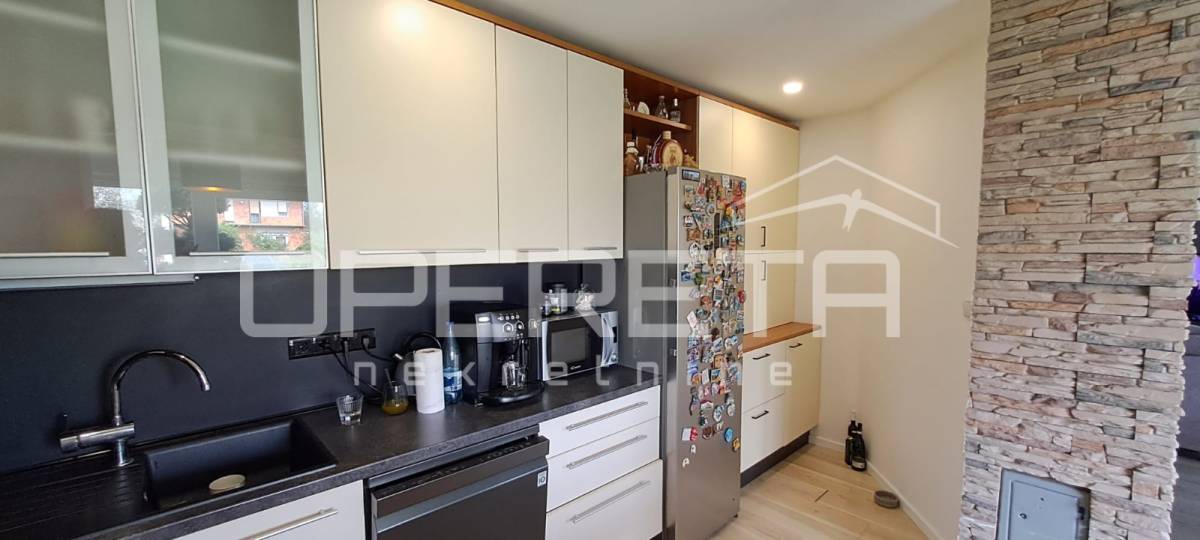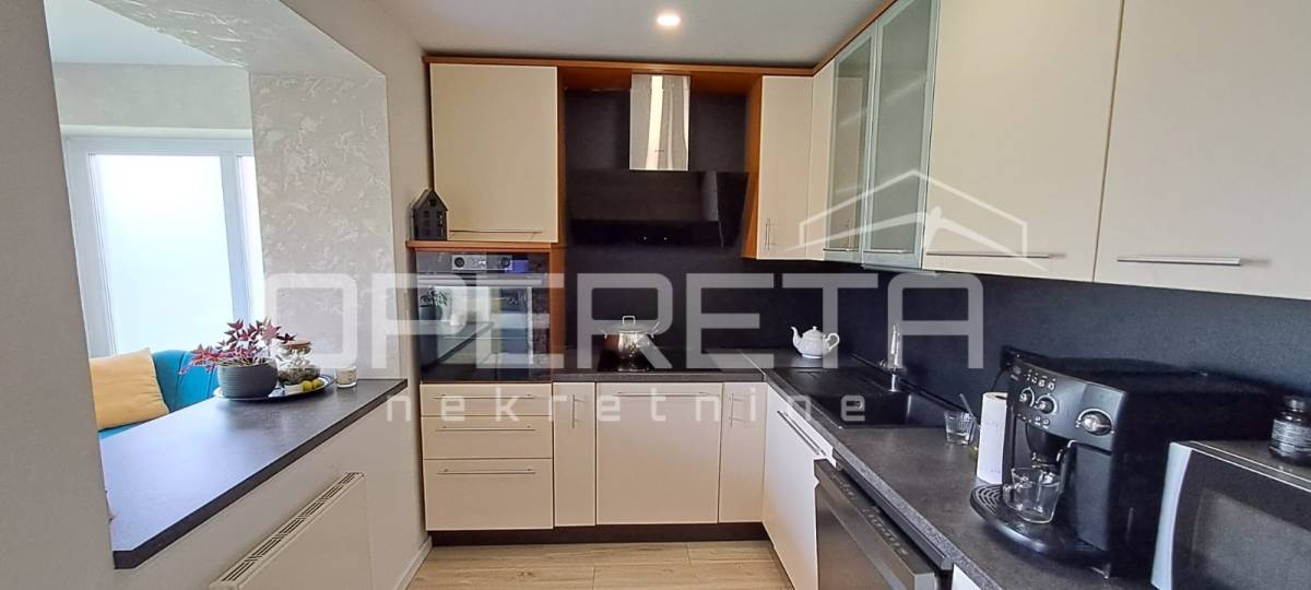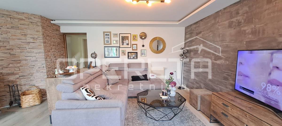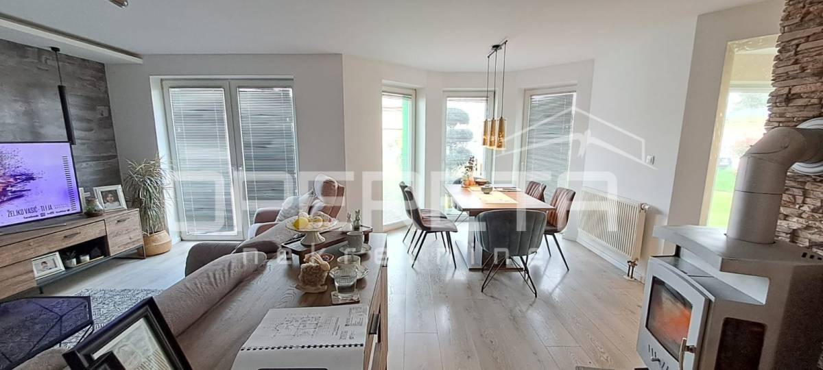 U prizemlju se nalazi prostrani open space dnevni boravak s blagovaonicom i kuhinjom, kao i dodatni, vrlo atraktivan ostakljeni prostor za odmor koji daje poseban ugođaj cijelom domu. Također, u prizemlju se nalaze još jedna veća soba, novouređena kupaonica i ostava.