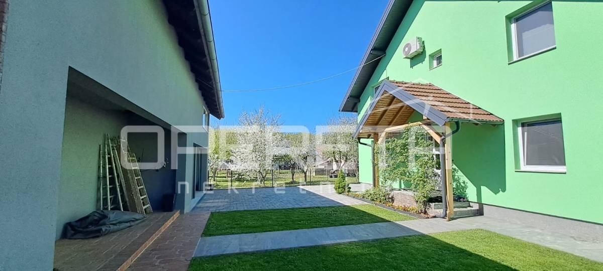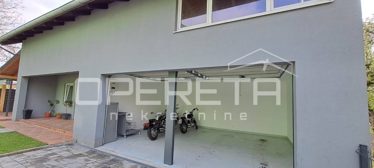 Iza kuće nalazi se pomoćna zgrada površine 115 m², koja uključuje dvostruku garažu s električnim podizanjem vrata, spremište te neuređeni kat koji nudi dodatne mogućnosti uređenja (ured ili slično). Na krovu su solarni paneli od 10,3KW i u garaži punjenje za električni auto.
