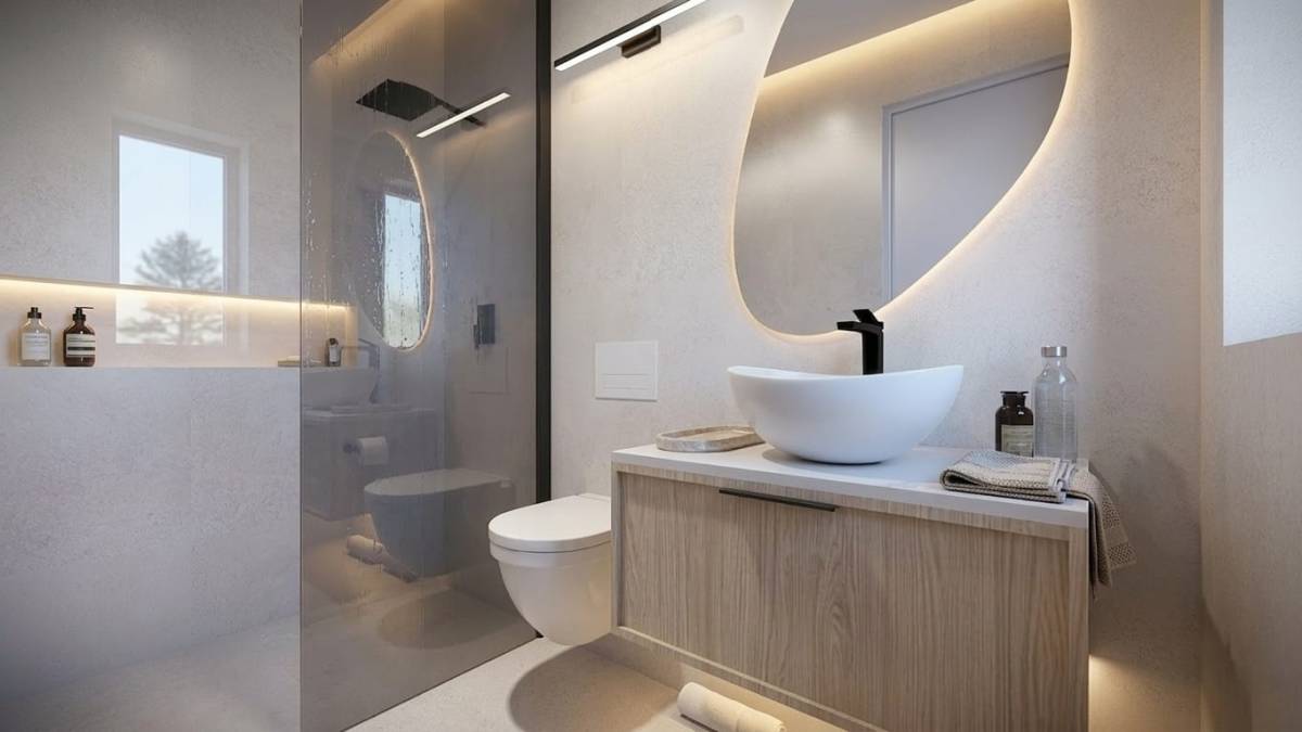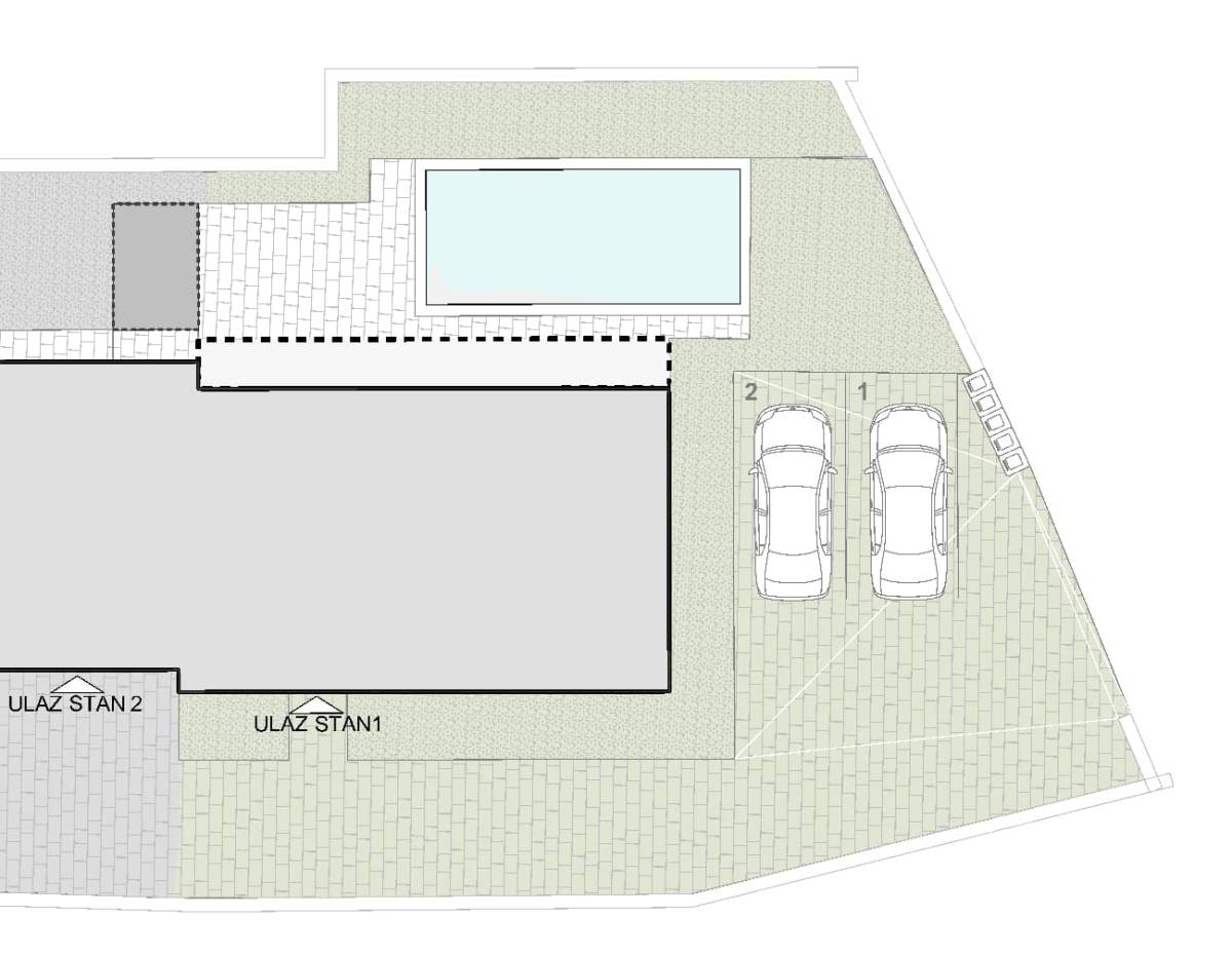 Riječ je o dvojnoj kući, ali razdvajanje je riješeno funkcionalno. Bazeni su postavljeni na suprotnim stranama parcele, pa se vanjski boravak ne preklapa sa susjedima i zadržava se osjećaj privatnosti unatoč zajedničkom zidu.