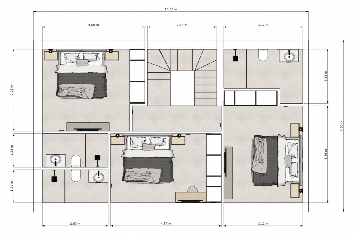 Na katu su tri spavaće sobe, svaka s vlastitom kupaonicom. Raspored omogućuje paralelno korištenje bez čekanja, što je čest zahtjev kod turističkog najma. Jedna soba ima veću terasu orijentiranu prema jugozapadu, s pogledom na zelenilo i more.