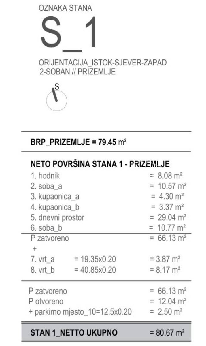 Stan S1 nalazi se u prizemlju i ima neto obračunsku površinu 80,67 m². Sastoji se od: hodnik: 8,08 m², soba 1: 10,57 m², kupaonica 1: 4,30 m², kupaonica 2: 3,37 m², dnevni boravak s kuhinjom i blagovaonicom: 29,04 m², soba 2: 10,77 m², vrt 1: 40.85x0.20 = 8.17 m², vrt 2: 19.35x0.20 = 3.87 m², parkirno mjesto_10: 12.5x0.20 = 2.50 m².