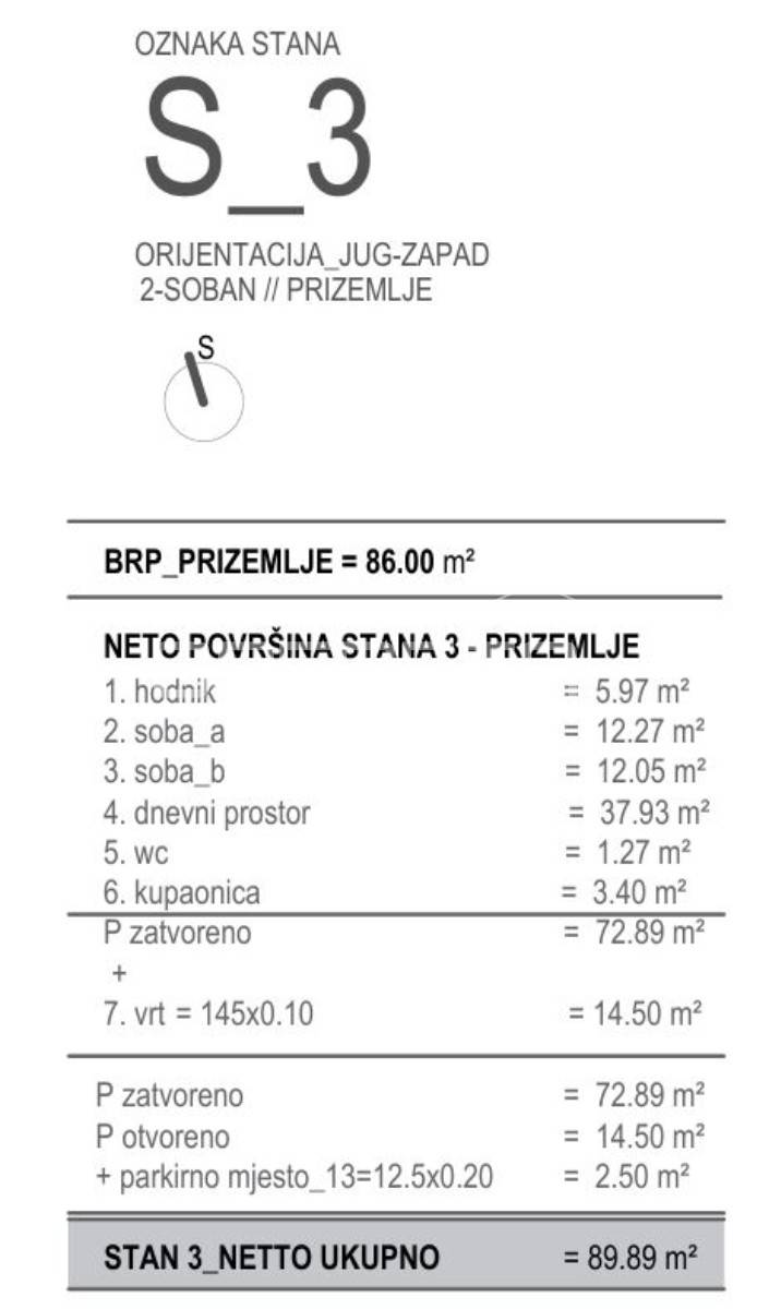 Apartment S3 is located on the ground floor and has a net floor area of 89.89 m². It consists of a hallway of 5.97 m², bedroom 1 of 12.27 m², bedroom 2 of 12.05 m², a living area of 37.93 m², a toilet of 1.27 m², a bathroom of 3.40 m², a garden of 14.50 m² (145×0.10), and a parking space of 2.50 m² (12.5×0.20).
