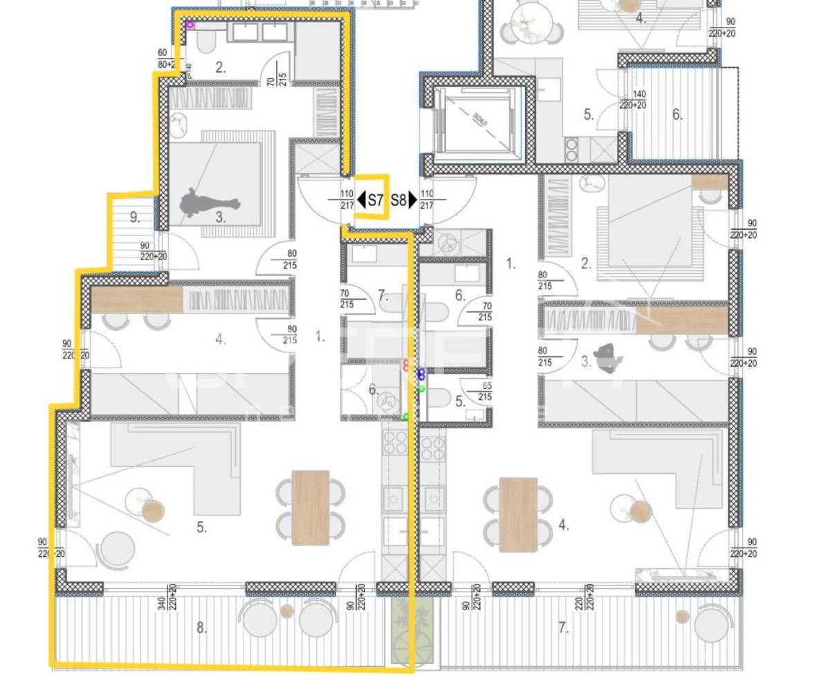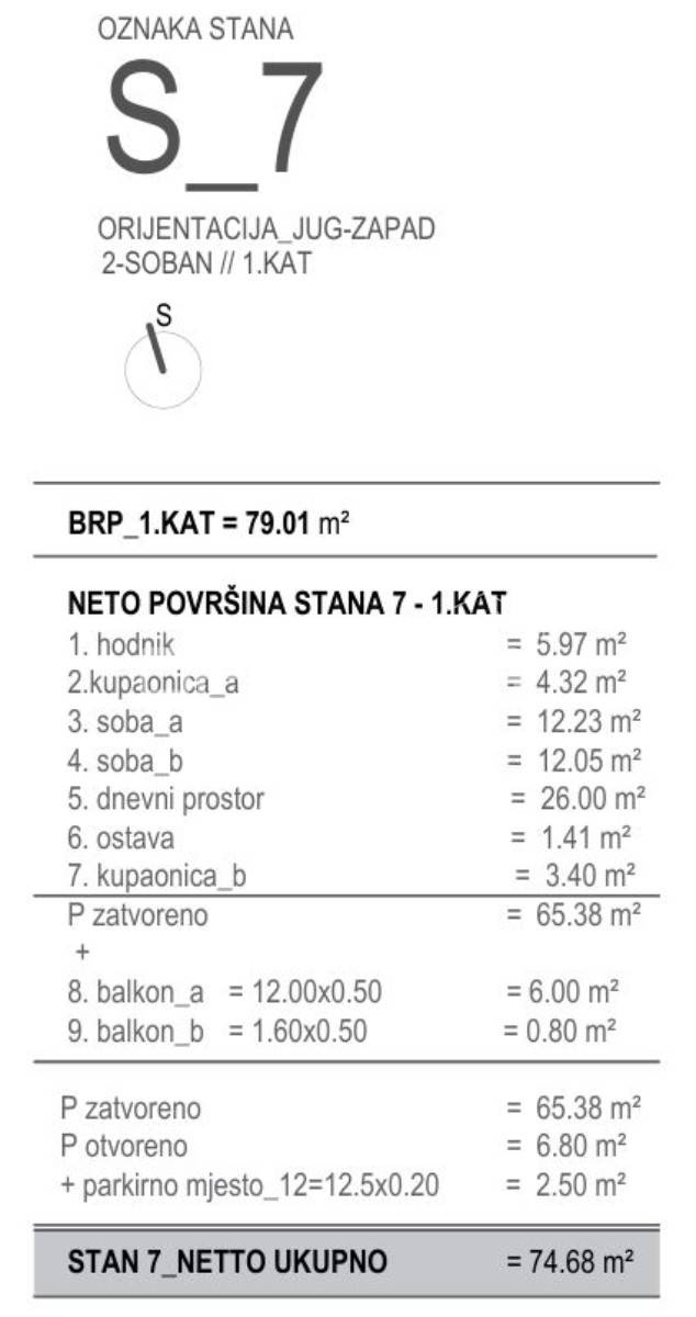 Stan S7 nalazi se na 1. katu i ima neto obračunsku površinu 76,86 m². Sastoji se od: hodnik = 5.97 m2, kupaonica_1 = 4.32 m², soba_1 = 12.23 m², soba_2 = 12.05 m², dnevni prostor = 26.00 m², ostava = 1.41 m², kupaonica_2 = 3.40 m², balkon_1 = 12.00x0.50 = 6.00 m², balkon_2 = 1.60x0.50 = 0.80 m², parkirno mjesto_12=12.5x0.20 = 2.50 m²