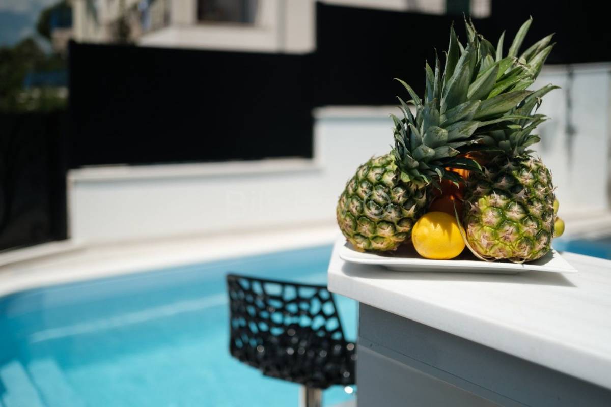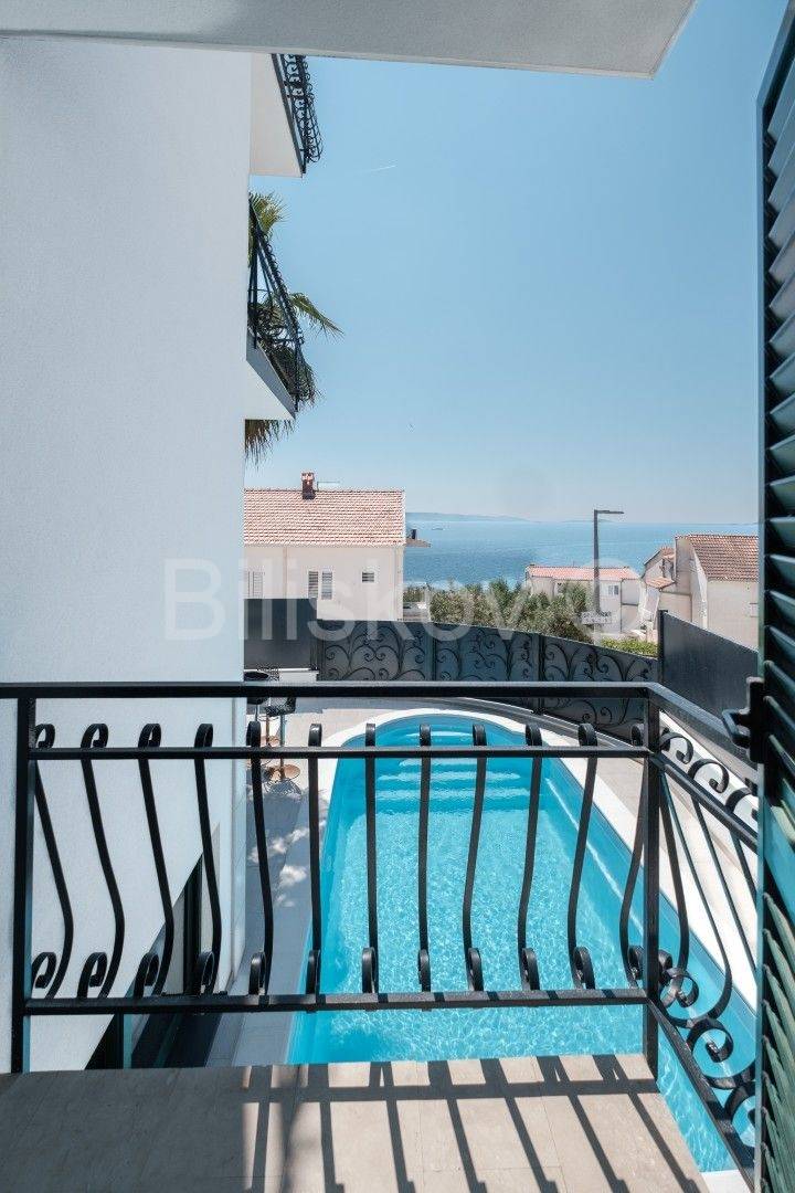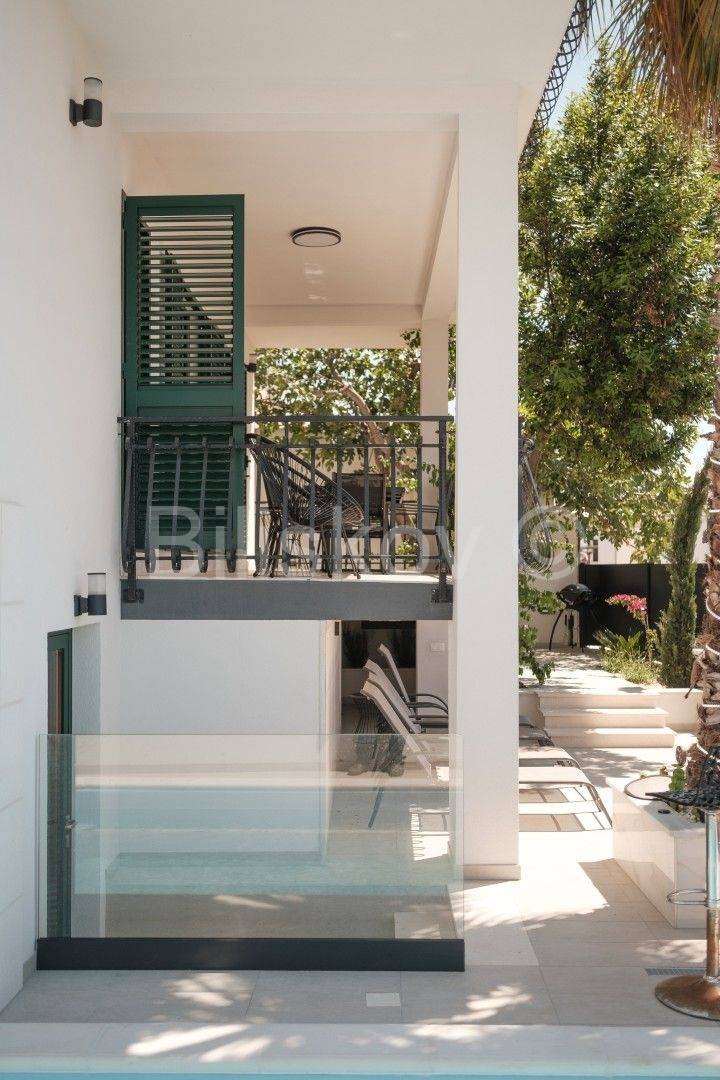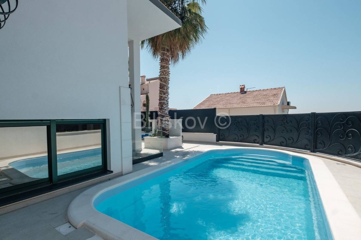 Prodajemo prekrasnu vilu udaljenu 120 metara od mora. Ova luksuzna vila nalazi se na parceli od 347 m2 i ima uređeni vrt, bazen, wellness s teretanom i saunom te parking za 4 automobila.