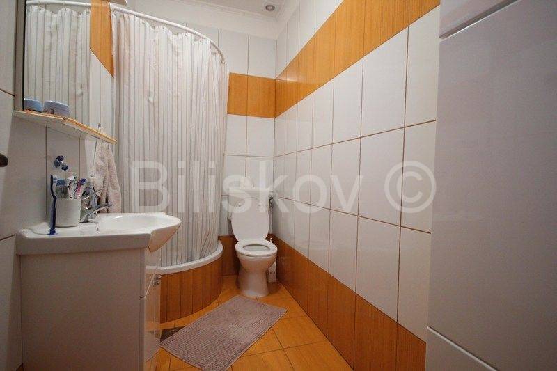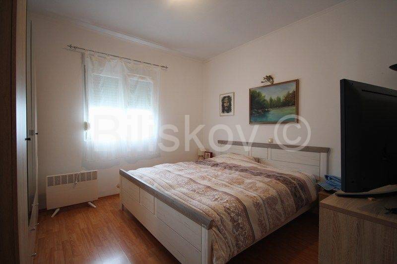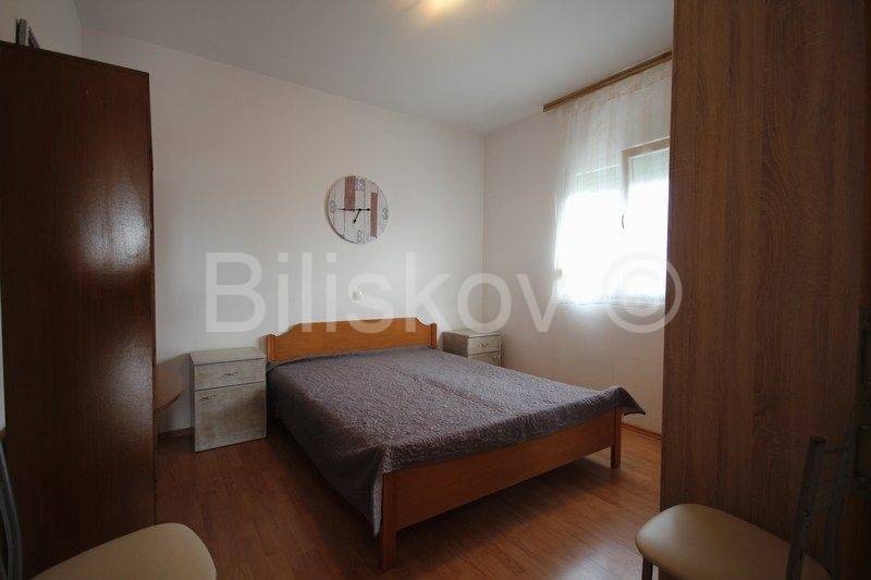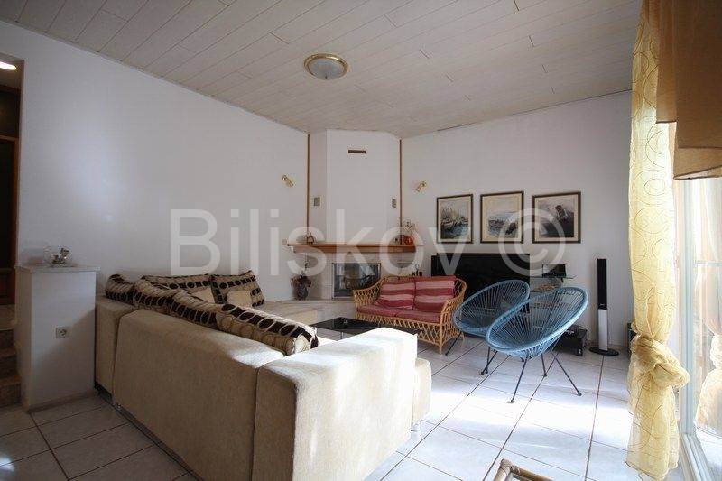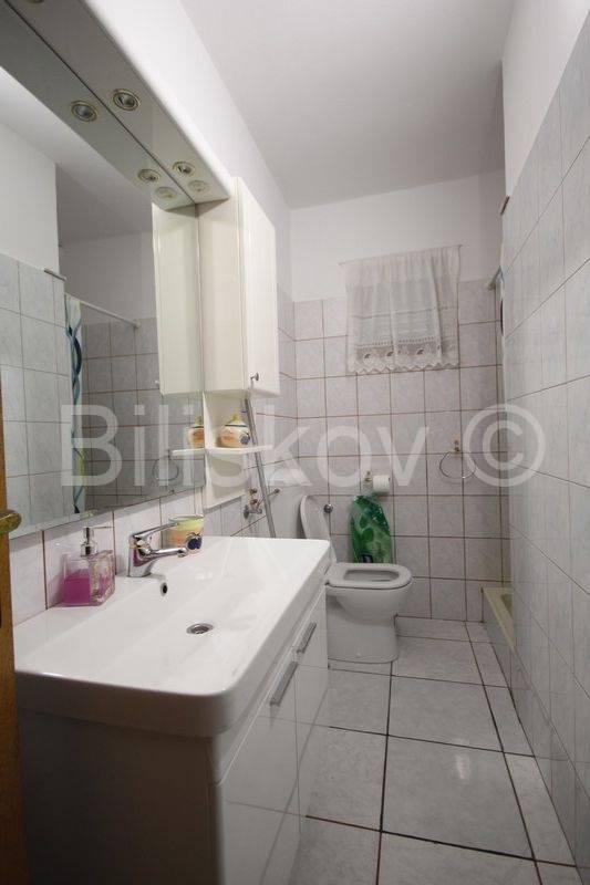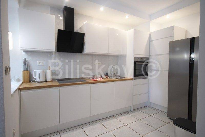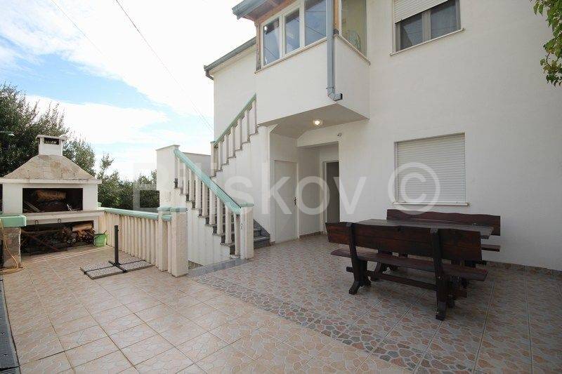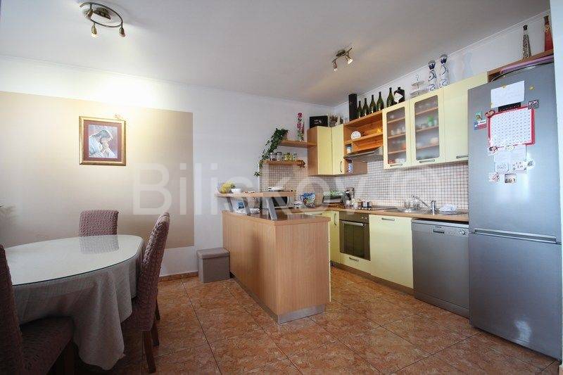 Vanjskim stepenicama dolazimo na prvi kat na kojem je smješten lijep, trosobni stan od 95 m2 stambenog prostora, 24 m2 terase i 21 m2 natkrivenog trijema.