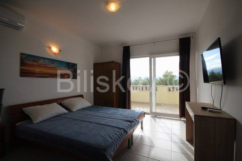 Dnevni prostor je otvorenog koncepta, a čine ga prostrana kuhinja sa šankom, blagovaonica i dnevni boravak koji imaju izlaz na veliku natkrivenu terasu s koje se pruža predivan pogled na more i otoke.