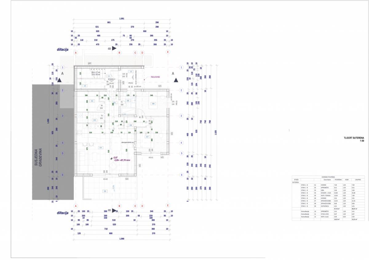 Stan se nalazi na visokom prizemlju i prostire se na funkcionalnih 94,51 m² korisne površine. Ulazni hodnik vodi u prostran dnevni boravak s kuhinjom površine preko 30 m², idealan za obiteljsko okupljanje i druženja. Iz dnevnog dijela izlazi se na natkrivenu terasu s djelomičnim pogledom na more, koja je savršeno mjesto za jutarnju kavu ili večernje opuštanje.