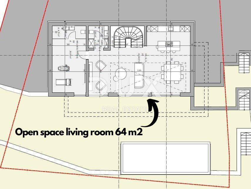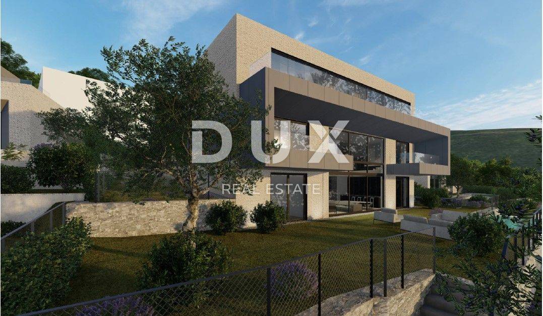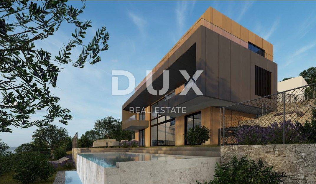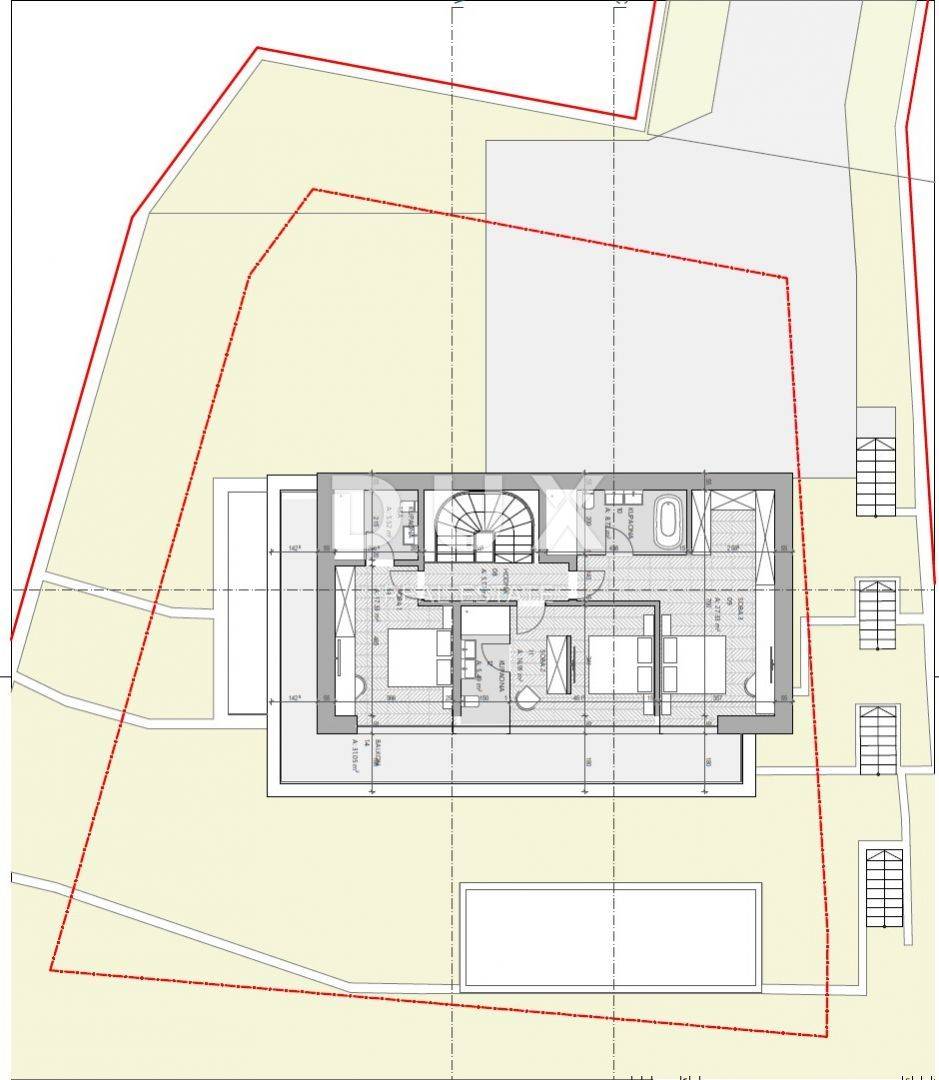 Predivna je to luksuzna vila na 3 etaže, a sastoji se od prostranog hodnika, predivnim i osvijetljenim open space dnevnim boravkom koji komunicira s kuhinjom i blagovaonicom iz koje se pruža veličanstven pogled na more kroz staklene stijene. Velikim stubištem dolazi se na 2. kat s 3 luksuzne spavaće sobe, a svaka soba je južno orijentirana te ima prekrasan pogled na more. Važno je istaknuti da se master spavaća soba s en suite kupaonicom prostire preko cijelog prvog kata te posjeduje lođu od 20 m2.