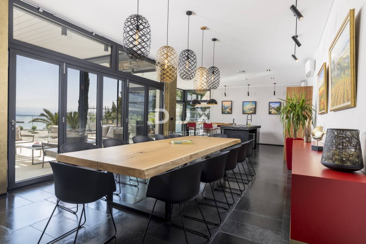 U prizemlju vile nalazi se hodnik koji vodi do jedne spavaće sobe s vlastitom kupaonicom te prostranog dnevnog boravka koji komunicira s blagovaonicom i velikom kuhinjom. Južni dio cijele etaže obložen je staklenim stijenama od poda do stropa, što prostorijama osigurava obilje prirodne svjetlosti te izravan izlaz na veliku terasu i bazen. U prizemlju se još nalazi vešeraj i dodatan WC. Vanjski prostor obogaćen je grijanim jacuzzijem, roštiljem i sunčalištem, a more se pruža na dlanu iz svakoga kuta.