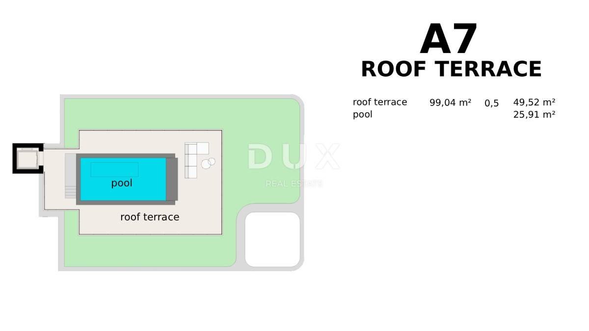 Prava zvijezda penthousea je krovna terasa s privatnim bazenom, s koje se pruža nezaboravan panoramski pogled na Kvarner i okolicu – idealna oaza za opuštanje i uživanje u suncu i zalascima. Krovna terasa ima privatni pristup liftom iz stana, što dodatno povećava ekskluzivnost i privatnost.