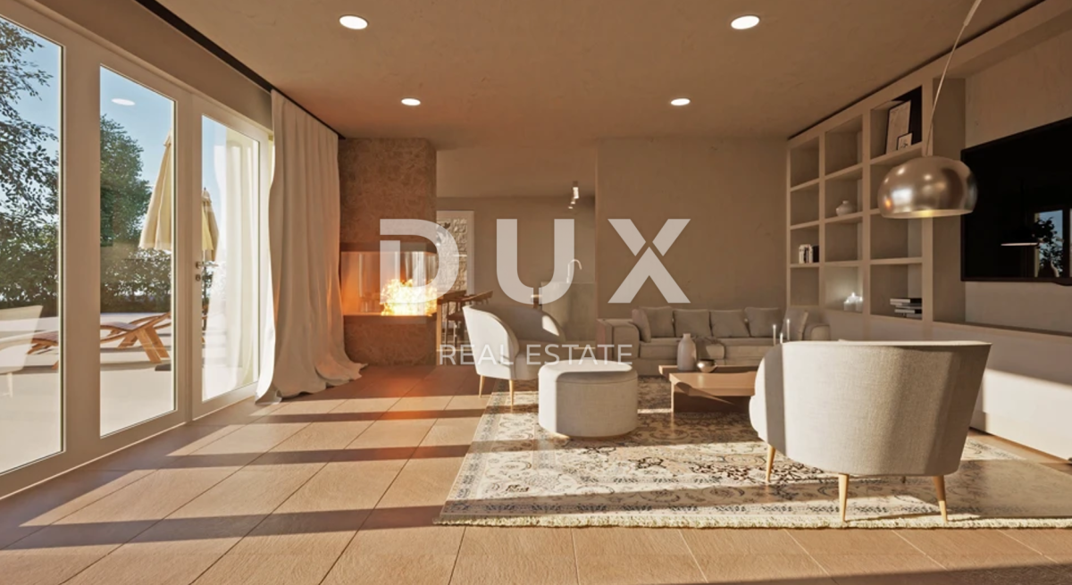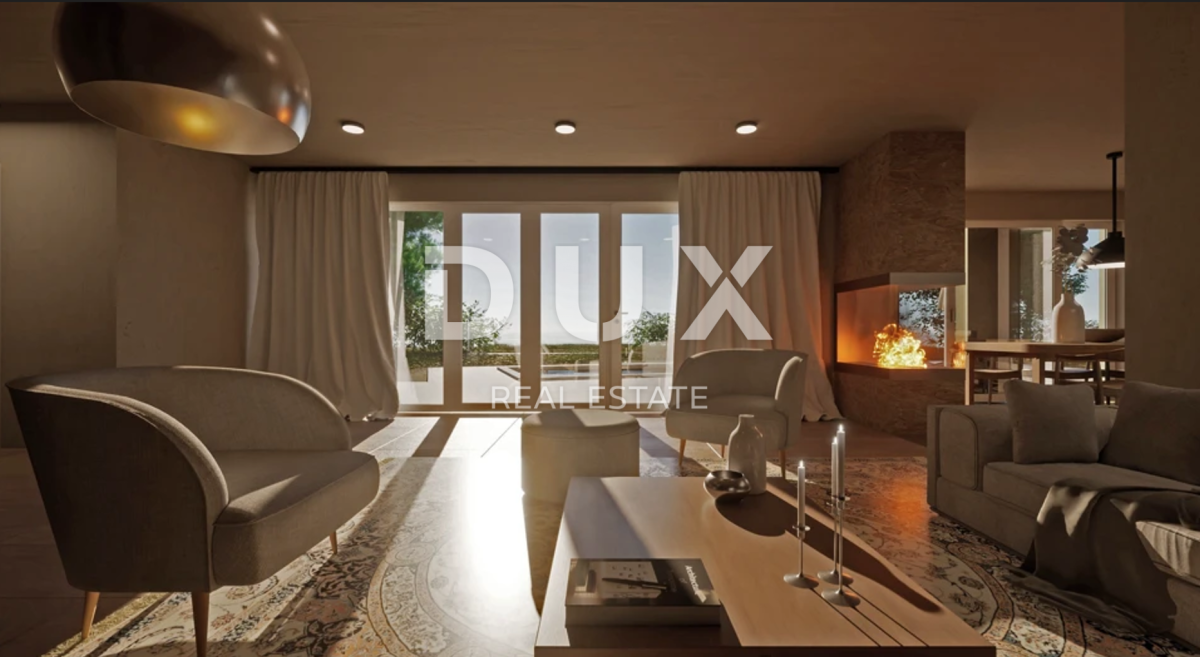 Dnevni boravak u prizemlju ima pogled na bazen i more. Između dnevnog boravka i prostrane otvorene kuhinje s blagovaonom nalazi se otvoreni kamin koji je vidljiv s obje strane.