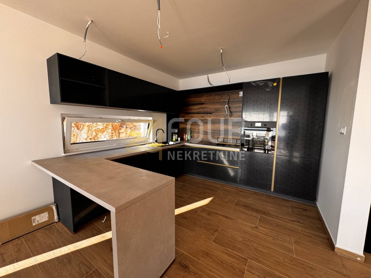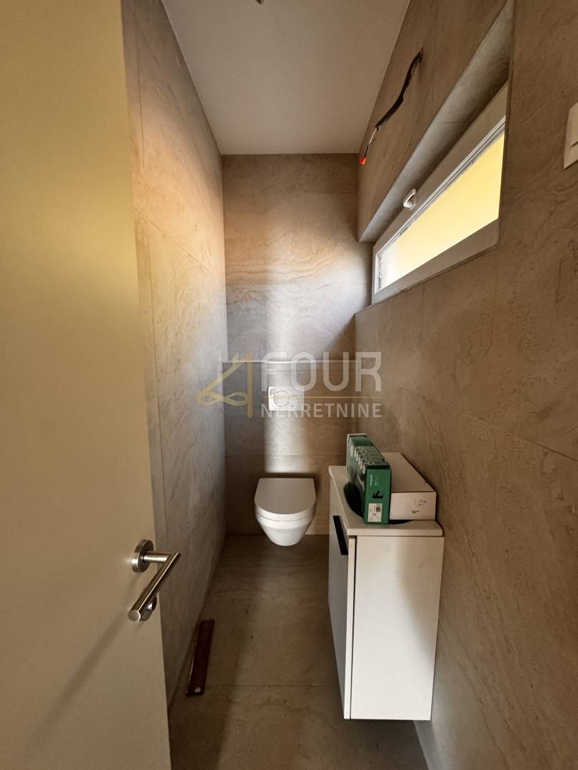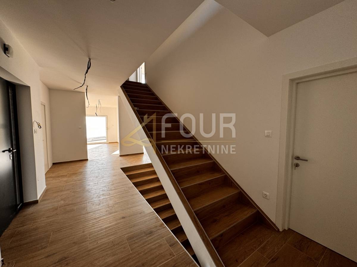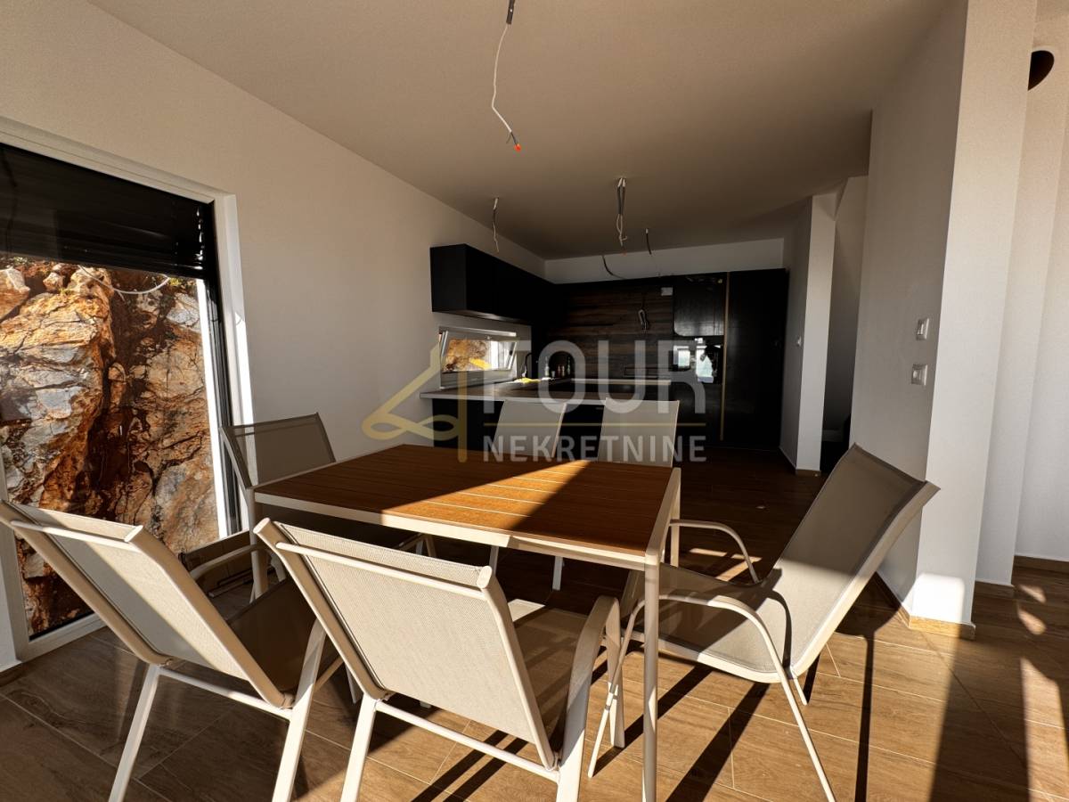 U prizemlju je smješten prostrani dnevni boravak povezan s kuhinjom i blagovaonicom, s izlazom na veliku terasu na kojoj se nalazi infinity bazen i prostor za sunčanje, idealan za uživanje u impresivnom pogledu na more. Na istoj etaži nalazi se i dodatna soba s vlastitom kupaonicom, predviđena kao gostinjska soba ili privatna spa zona sa saunom i jacuzzijem.