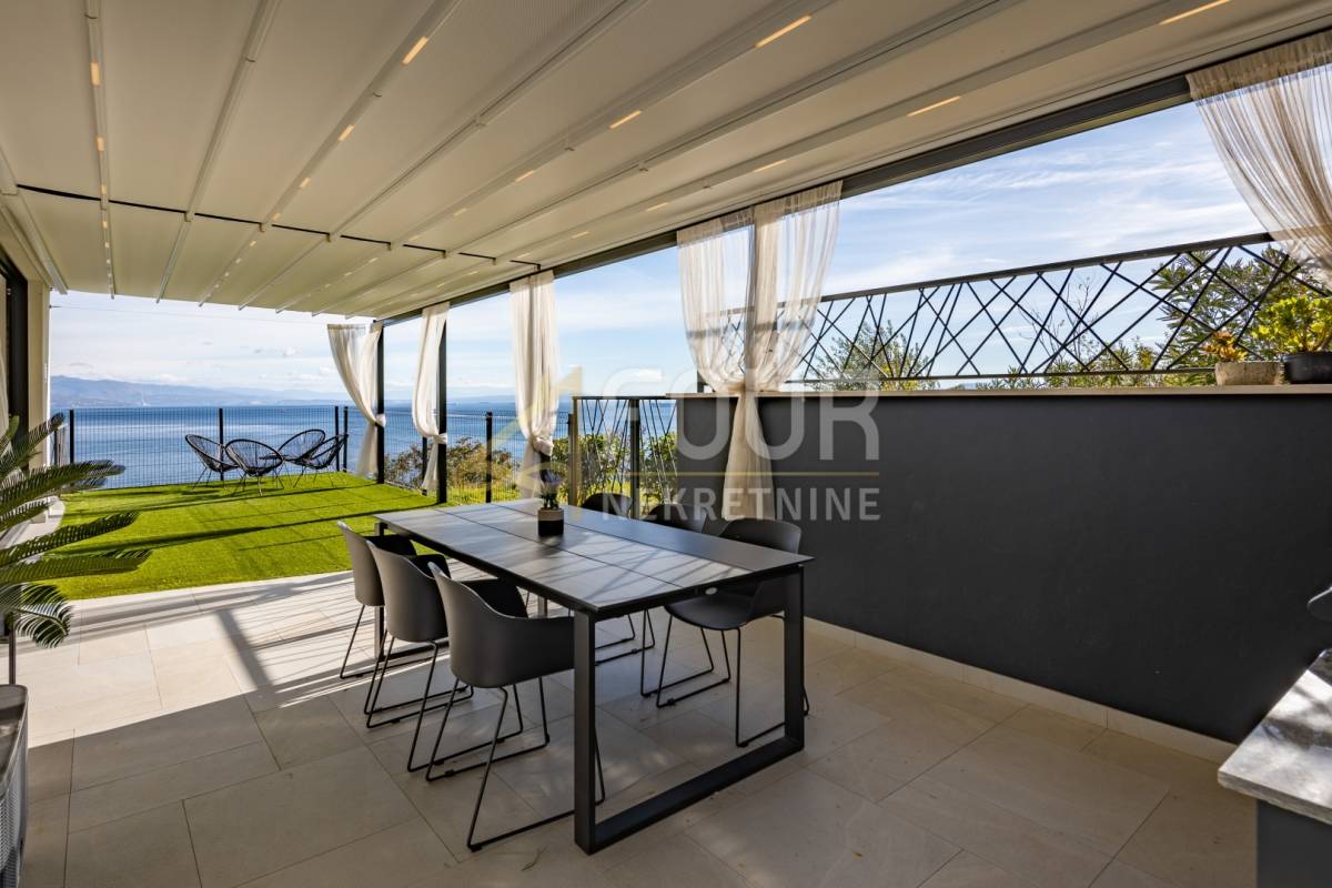 Stambeni dio u visokom prizemlju osmišljen je kao reprezentativan prostor za život i druženje, s prostranim dnevnim boravkom povezanim s kuhinjom i blagovaonicom iz kojih se izlazi na veliku terasu s panoramskim pogledom na more. Natkrivena terasa opremljena je automatiziranim pergolama i ljetnom kuhinjom, stvarajući savršen ambijent za boravak na otvorenom tijekom cijele godine.