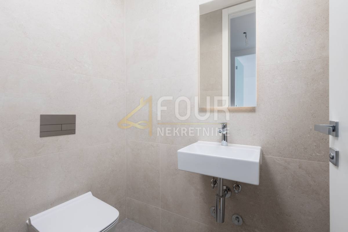 Prodaje se stan u moderno izvedenoj novogradnji u Opatiji, smješten u prizemlju zgrade. Objekt se sastoji od dvanaest stanova i luksuznog penthousea, a projekt je izveden s posebnom pažnjom na kvalitetu materijala, funkcionalnost prostora i ugodnu estetiku. Zgrada nudi potpunu privatnost, mirnu poziciju i otvoren pogled na more, a završni radovi na okućnici i posljednjim detaljima privode se kraju.Zgrada je opremljena liftom, a stanovi imaju podno grijanje, dizalicu topline, vrhunsku stolariju, kvalitetan parket i keramiku te visoku razinu završne obrade kako u interijeru tako i u zajedničkim prostorima.