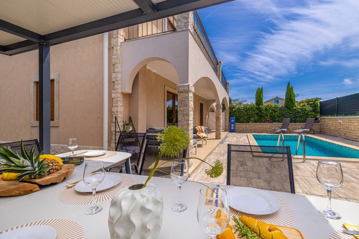 U prizemlju se nalazi kuhinja otvorenog tipa povezana s blagovaonicom i dnevnim boravkom, s izlazom na natkrivenu terasu i uređenu okućnicu. Dodatno se na toj etaži nalaze ulazni hodnik, jedna spavaća soba i kupaonica. Vanjski prostor obuhvaća privatni bazen, sunčalište i ljetnu kuhinju s roštiljem.