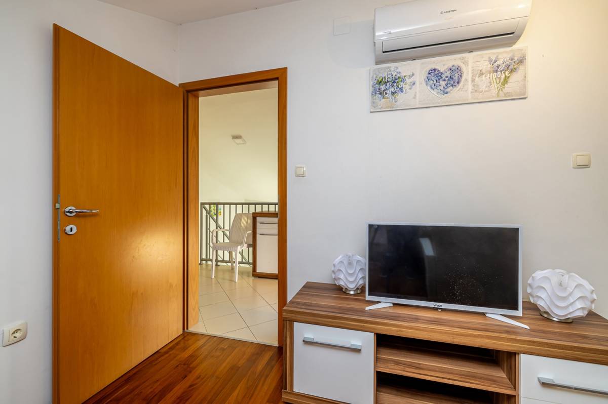 Gornja etaža sastoji se od jedne spavaće sobe, kupaonice te izlaza na veliku, nenatkrivenu terasu s pogledom na more. Terasa predstavlja jednu od ključnih prednosti ove nekretnine i pruža idealan prostor za opuštanje i uživanje tijekom cijelog dana.