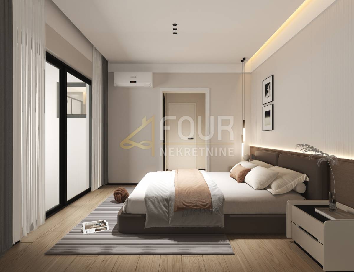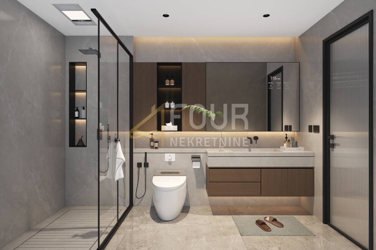 U suterenu se nalazi trosoban stan u kojem jedna spavaća soba ima vlastitu garderobu i status master sobe, dok su preostale dvije spavaće sobe smještene uz dodatnu kupaonicu i spremište. Iz svake sobe omogućen je izlaz na prostranu terasu. U prizemlju je smješten atraktivan open-space dnevni dio s kuhinjom i blagovaonicom, ulaznim prostorom, toaletom te stepeništem koje vodi na krovnu terasu površine oko 60 m2, idealnu za opuštanje i stvaranje dodatne lounge zone.