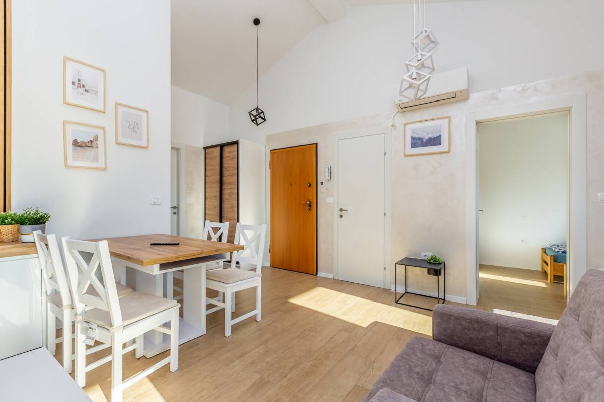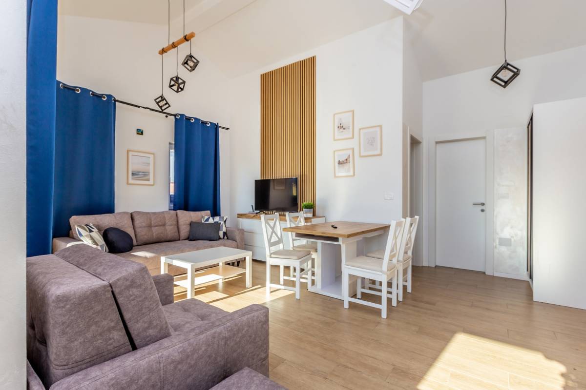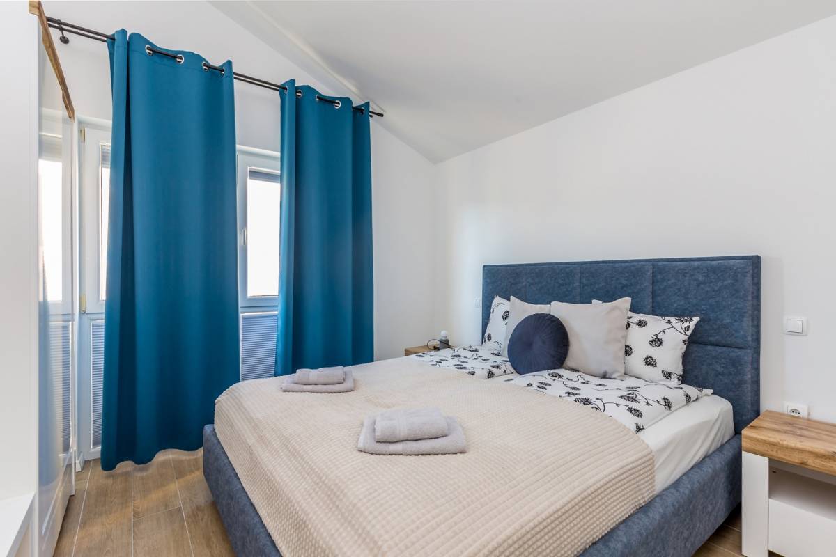 Interijer apartmana odiše svježinom i funkcionalnošću. Sastoji se od dvije udobne spavaće sobe, moderne kupaonice, praktične ostave te prostranog dnevnog prostora koji uključuje kuhinju, blagovaonicu i dnevni boravak u otvorenom konceptu. Najveći adut apartmana je natkrivena terasa s otvorenim pogledom na more – savršena za jutarnju kavu ili večernji odmor uz zalazak sunca.