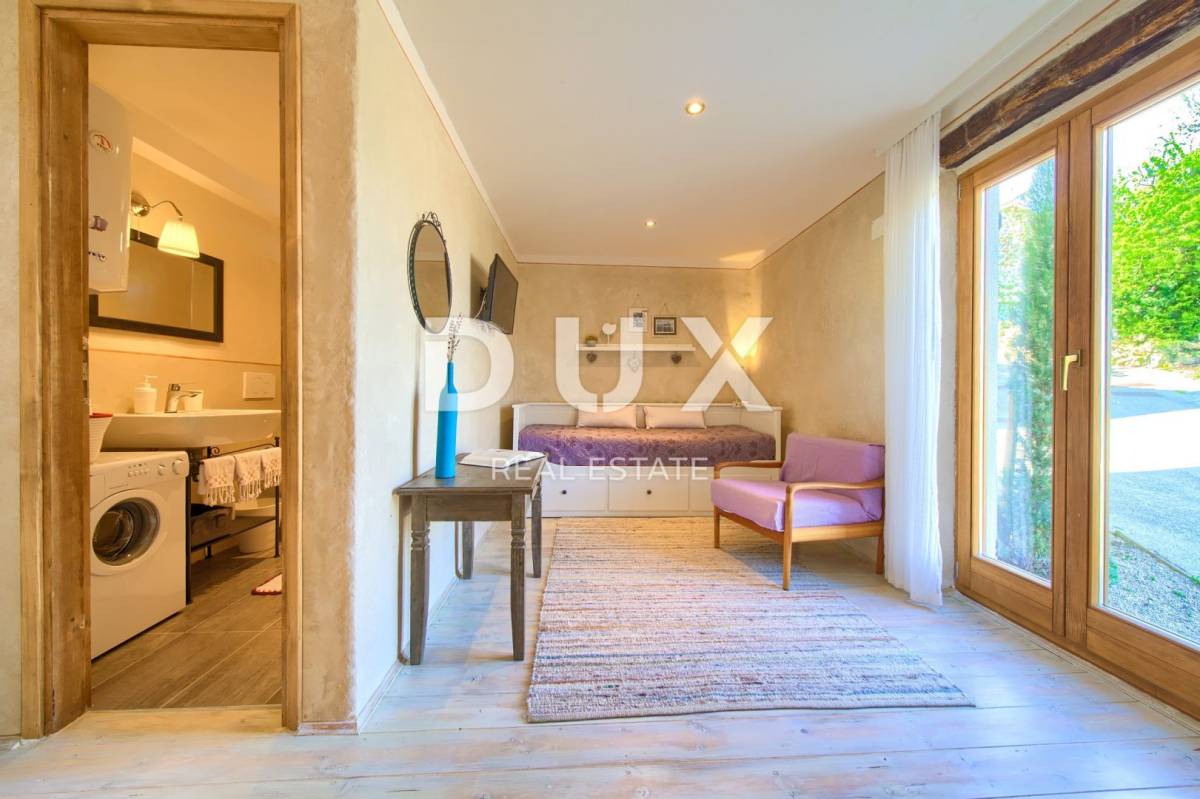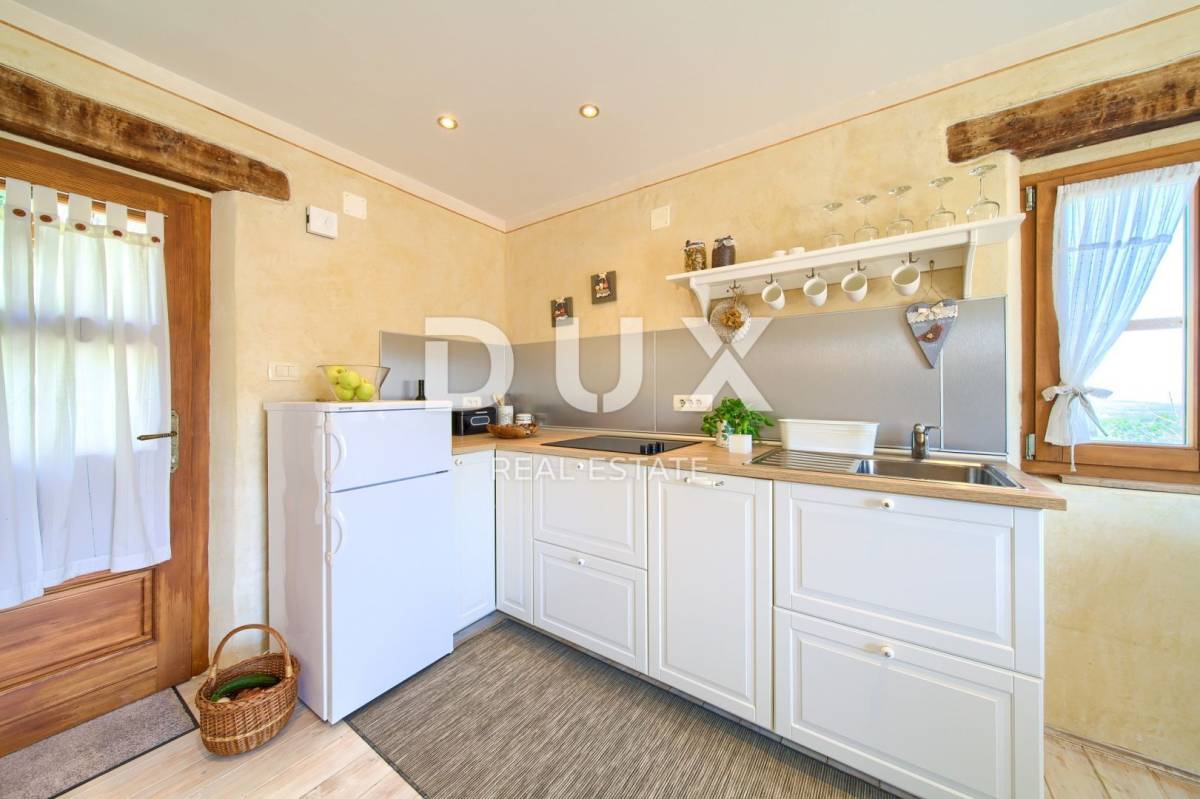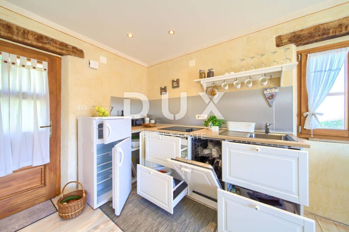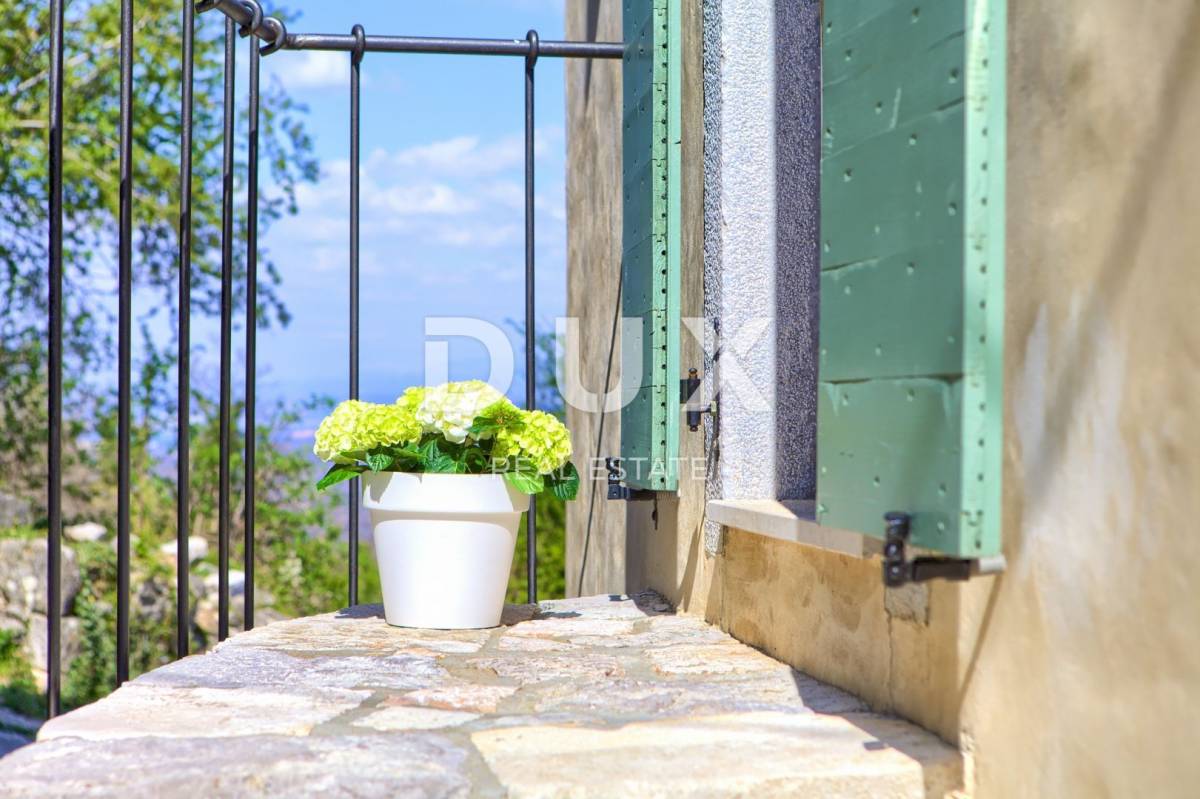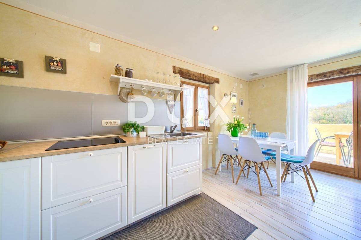 Nalazi se na mirnoj lokaciji u mjestu Dobrinj s pogledom na more i zelenilo, a opet na manje od 100 metara do trgovine i restorana. Kuća je potpuno renovirana 2016. godine, odnosno izgrađena iz temelja modernim tehnikama gradnje. Na lijepo uređenoj okućnici, nalazi se jacuzzi, natkrivena terasa, te dva spremišta i dva parkirna mjesta. U prizemlju kuće se nalazi jedna spavaća soba, kupaonica dnevni boravak iz kojeg se izlazi na okućnicu. Na prvom katu nalaze se kuhinja i blagovaona iz koje se izlazi na balkon s kojeg se pruža otvoreni pogled. Na drugom katu je još jedna spavaća soba s kupaonicom. Grijanje je na drva i na klima uređaje.