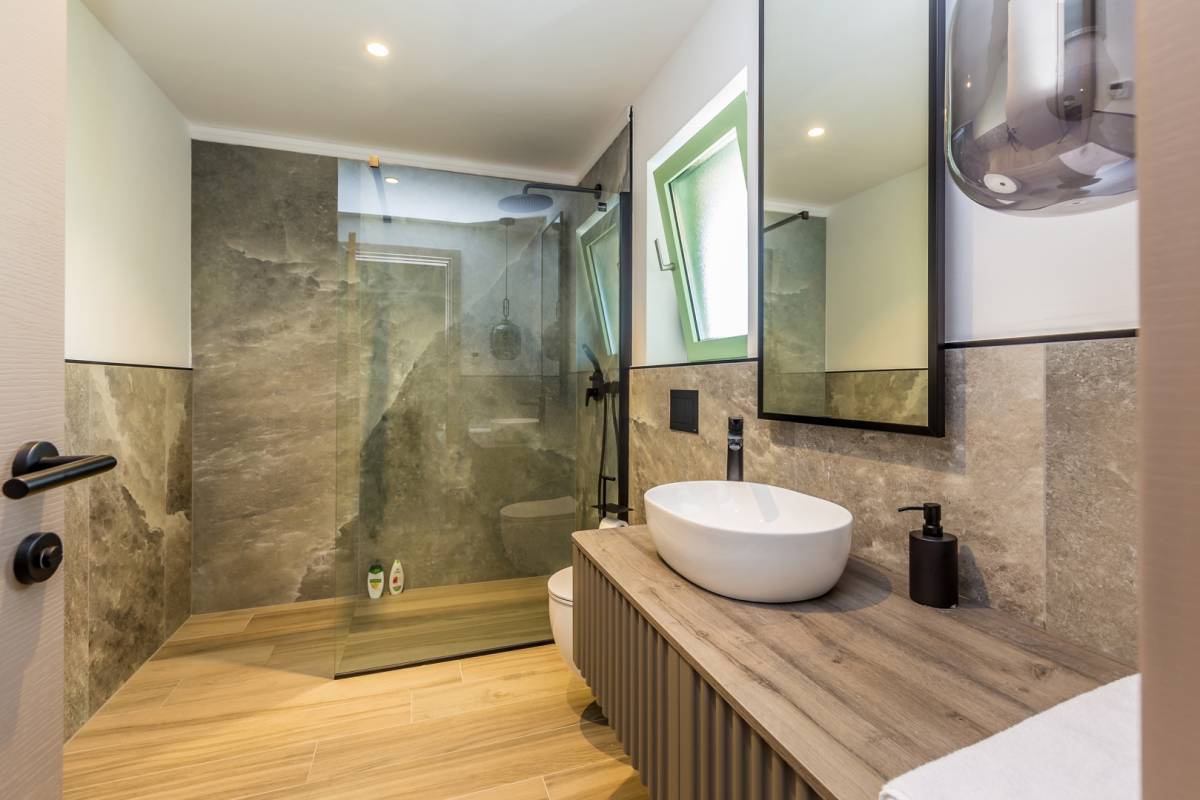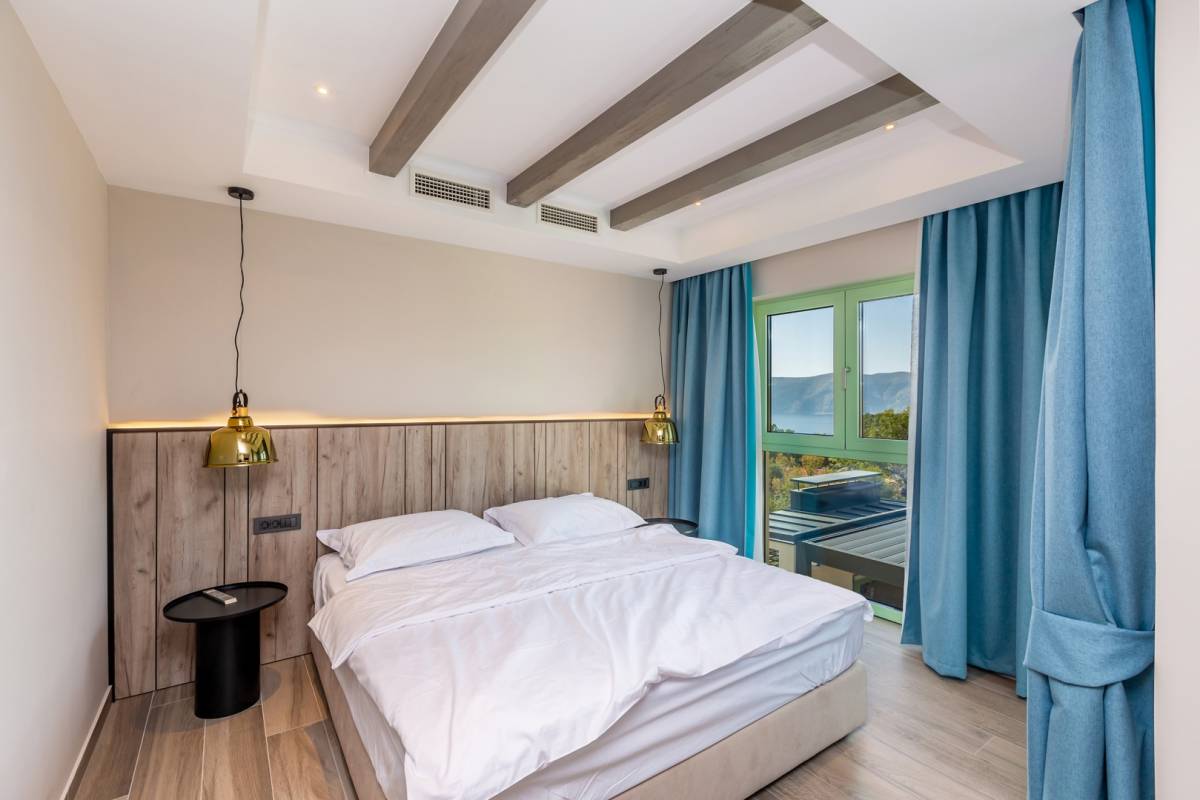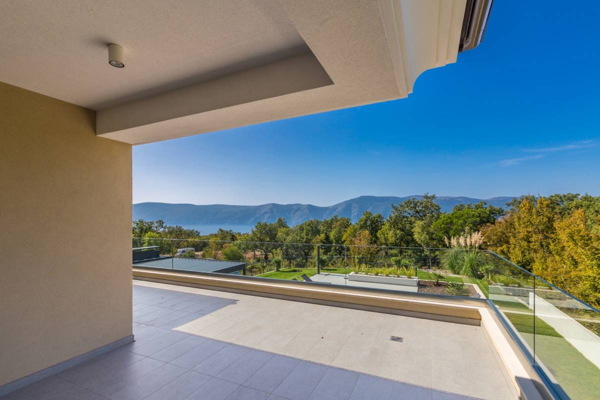 Unutarnje stubište vodi na kat gdje se nalaze tri prostrane spavaće sobe, svaka s vlastitom kupaonicom i izlazom na privatnu terasu s koje se pruža panoramski pogled na more i otok Cres.