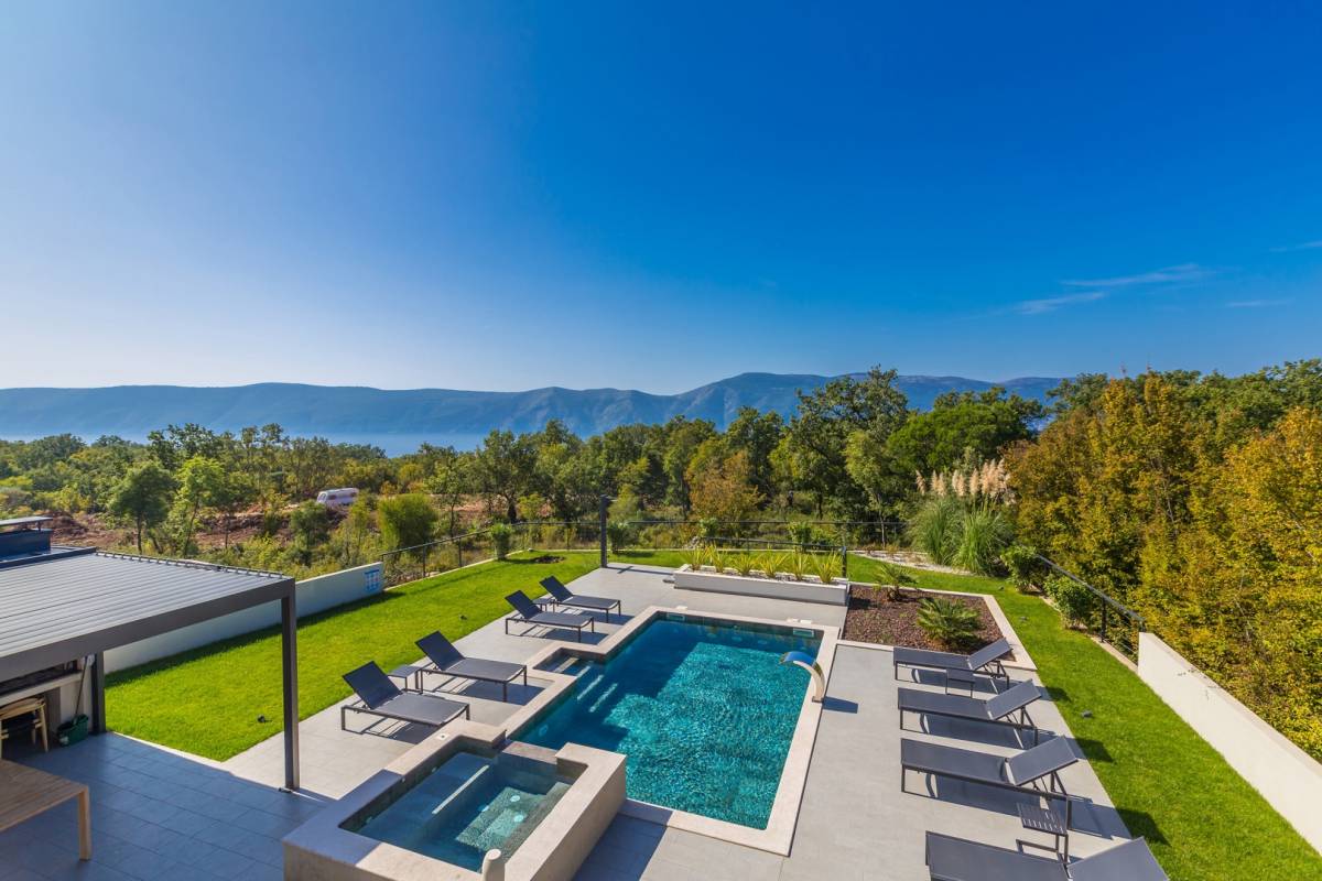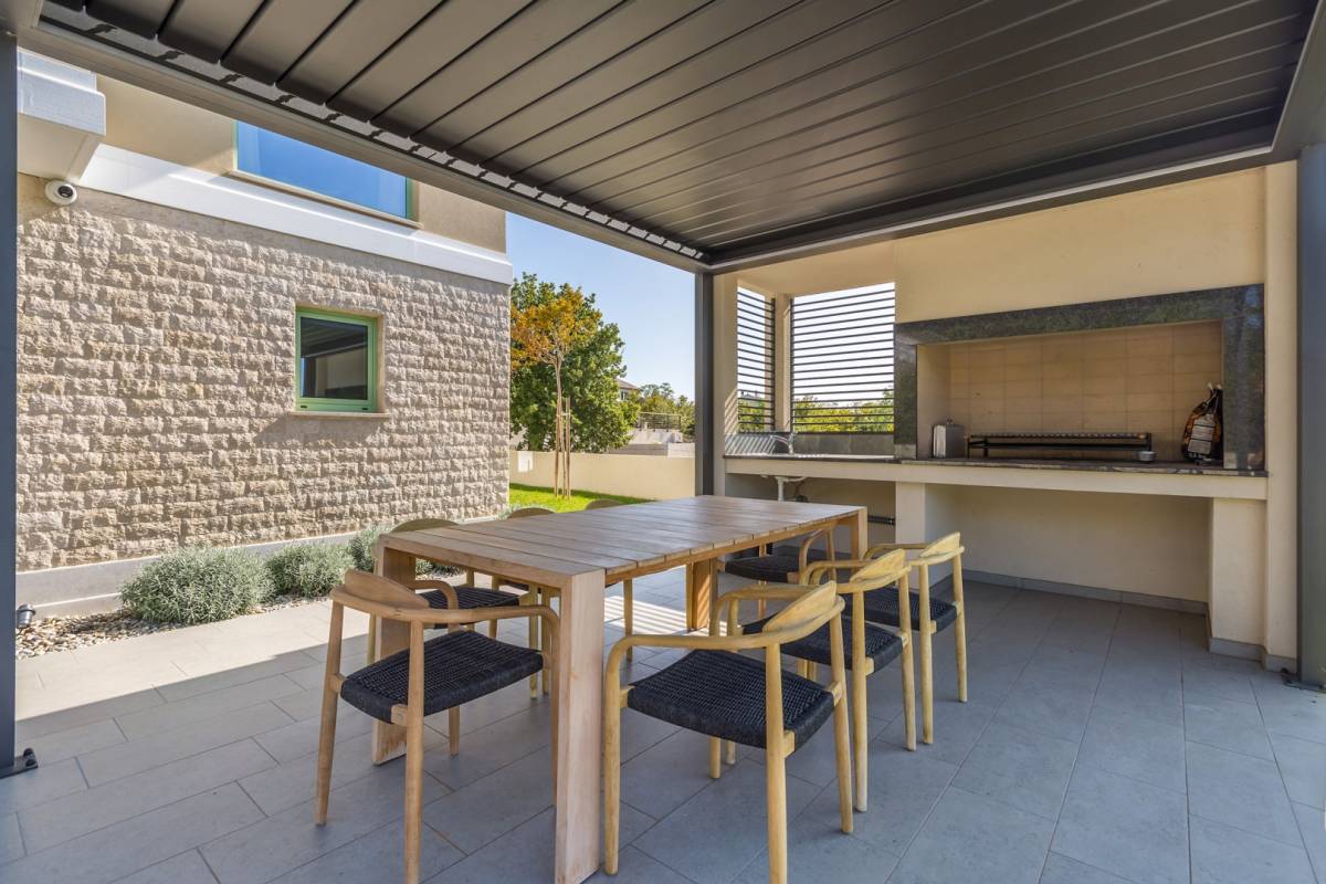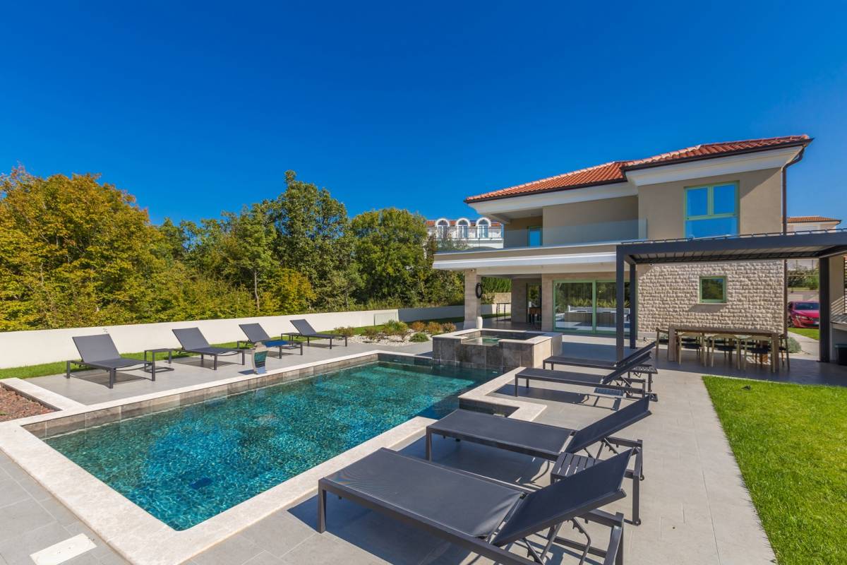 Okućnica je jednako impresivna: uz bazen sa slapom i whirlpoolom za 6 osoba, tu su sunčalište, ljetna kuhinja s roštiljem i više parkirnih mjesta. Ambijentalna rasvjeta, dizajnerski namještaj i suvremena oprema protežu se kroz cijeli interijer, a sustav grijanja i hlađenja temeljen na toplinskoj pumpi s podnim grijanjem i fan-coil sustavima jamči maksimalnu udobnost.