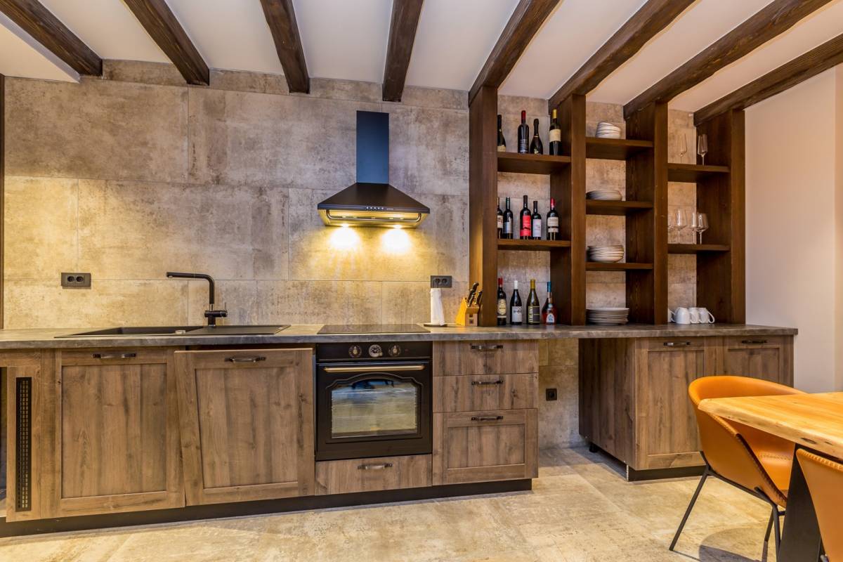 Ulaskom u prizemlje otvara se prostrani dnevni prostor – moderno uređena kuhinja s elegantnim šankom povezuje se s blagovaonicom i dnevnim boravkom u kojem dominira dizajnerski kamin. Iz dnevnog dijela izlazi se na veliku natkrivenu terasu i uređenu okućnicu s bazenom. Prizemlje također uključuje gostinjski toalet i praktičnu ostavu.