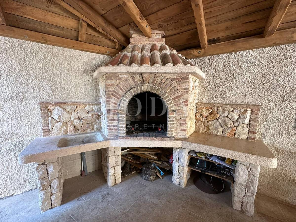 S terase pristupa se okućnici na kojoj se nalazi nadstrešnica s roštiljem, veliki grijani bazen s mozaikom i slanom vodom (32 m2) kao i kamena kućica predviđena za saunu s prostorom za fitnes.
