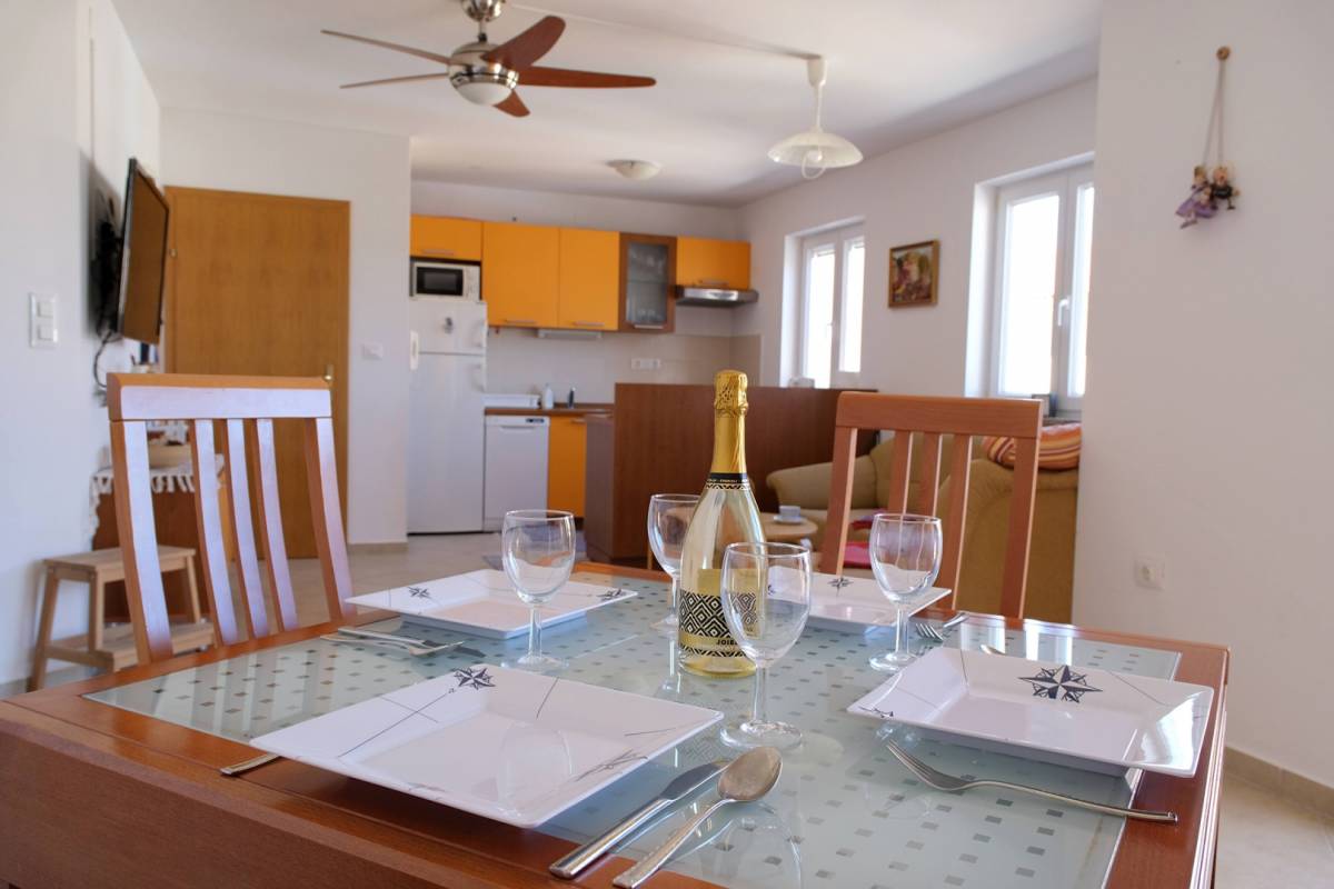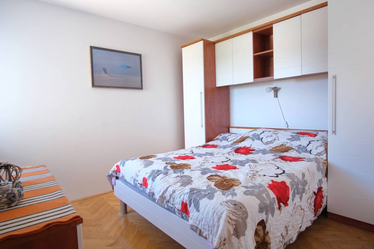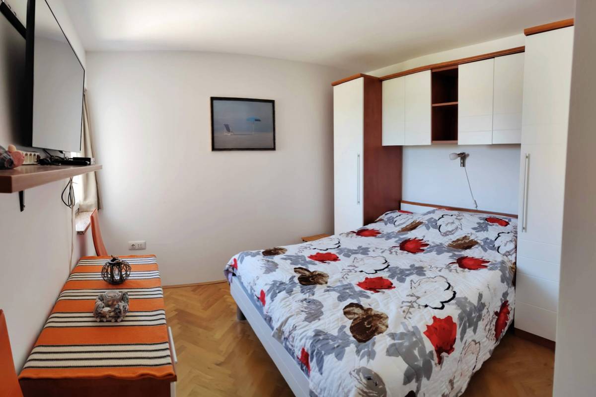 Ukupne površine 57 m², prostor je funkcionalno raspoređen: svijetao dnevni boravak povezan s blagovaonicom i potpuno opremljenom kuhinjom, dvije spavaće sobe, kupaonica, dodatni WC te prostrani balkon s prekrasnim pogledom na more. Apartman je klimatiziran novom jedinicom za grijanje i hlađenje, a pripada mu i vlastito parkirno mjesto ispred zgrade, uključeno u cijenu.