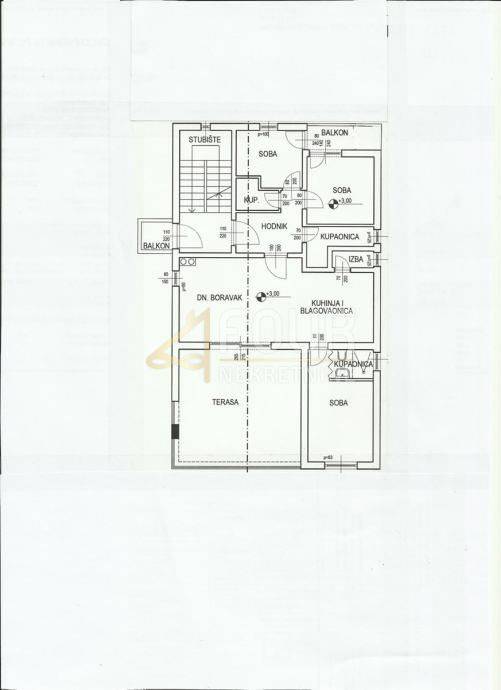 Sastoji se od kuhinje s dnevnim boravkom, tri spavaće sobe, tri kupaonice, hodnika, dva balkona i krovne terase od 20m2.