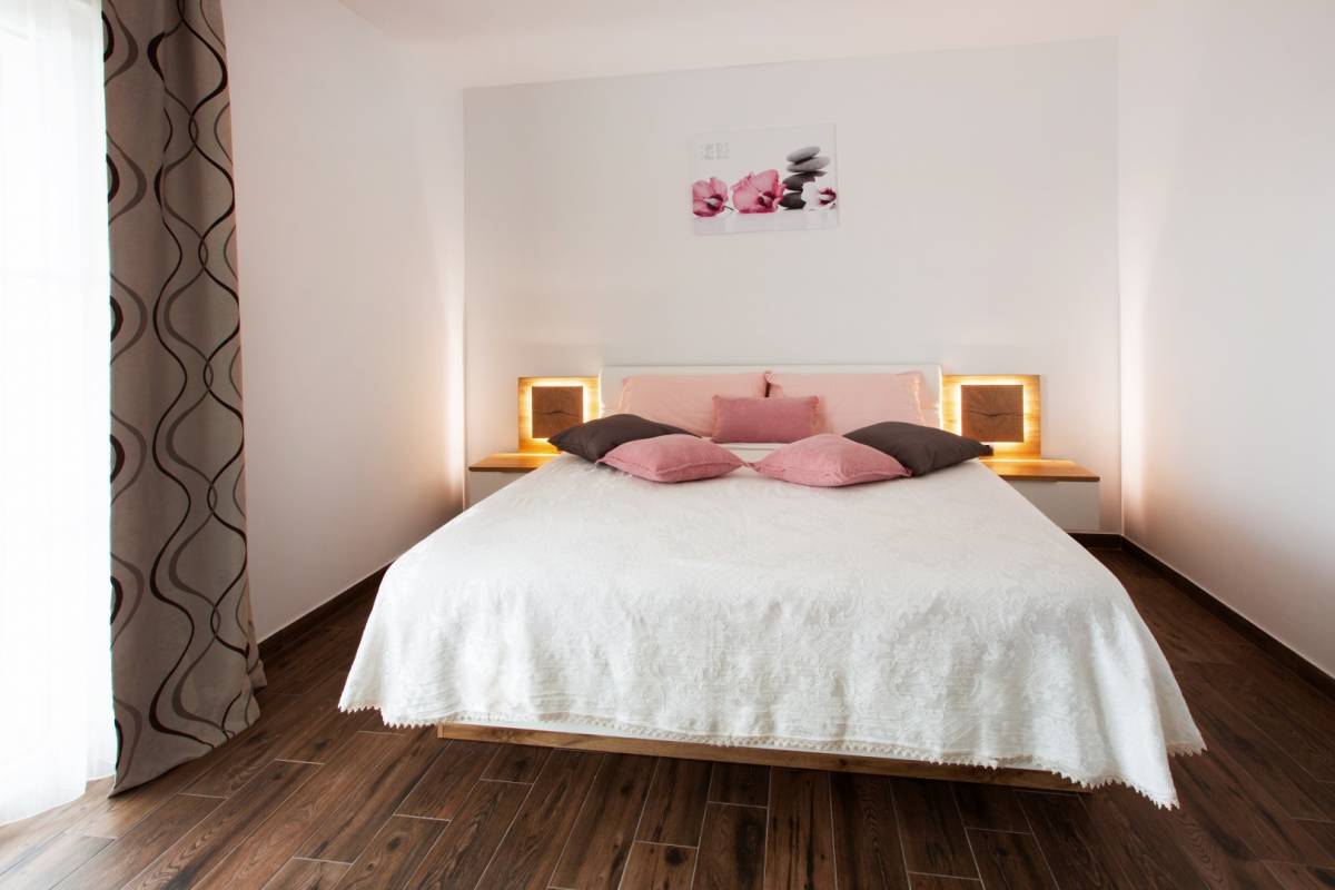 Na katu se nalaze dvije prostrane spavaće sobe, svaka s vlastitom kupaonicom i izlazom na veliki balkon koji pruža spektakularan panoramski pogled na more, što svakodnevno osigurava osjećaj potpune relaksacije.