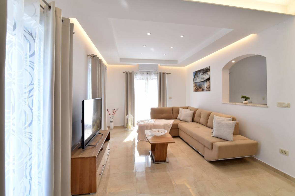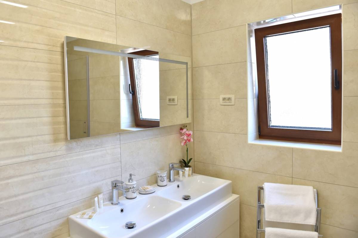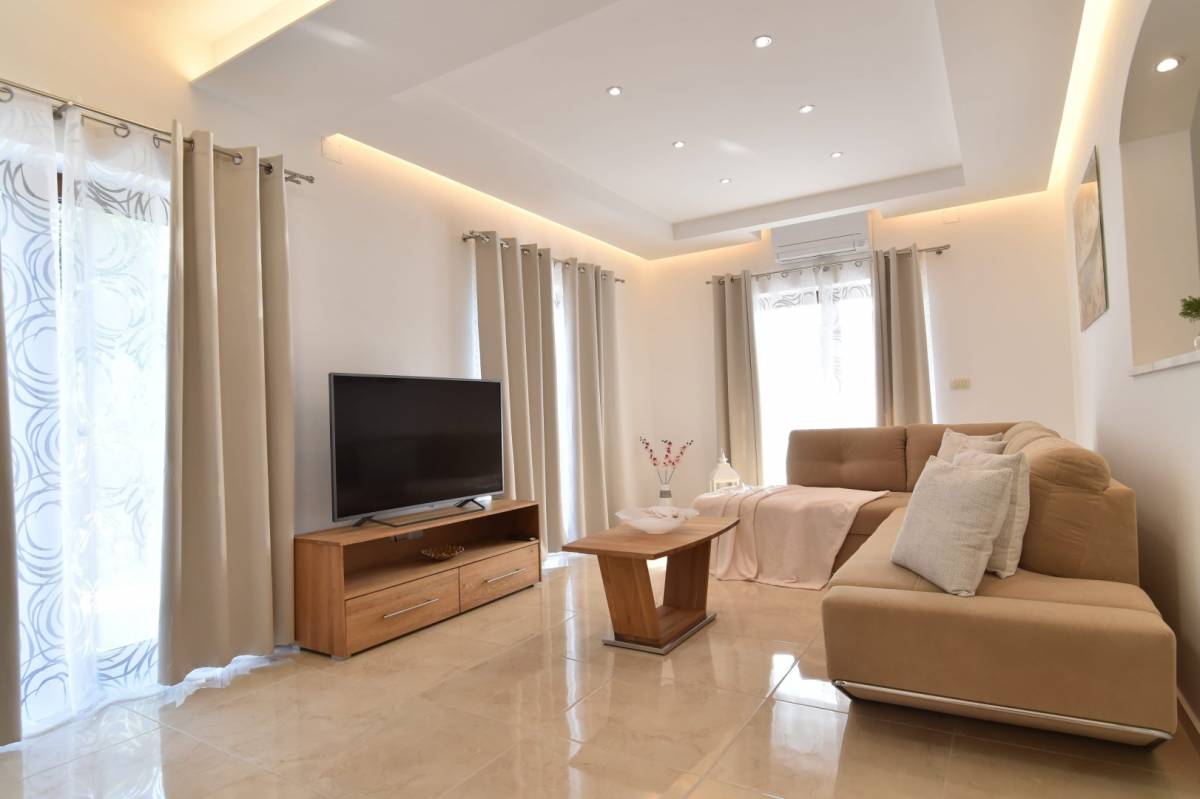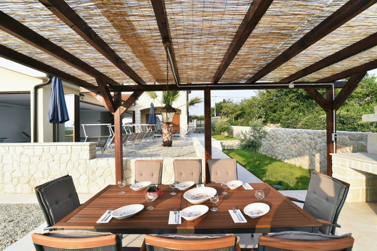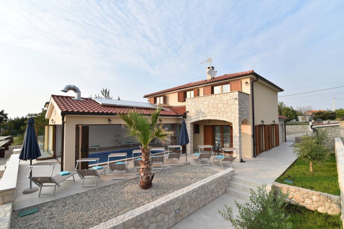 Okućnica je uređena mediteranskim biljem i palmama, a dodatno obuhvaća prostor za roštiljanje, sunčalište te natkriveni parking s dodatnim spremištem za bicikle. Vila je opremljena podnim grijanjem u svim prostorijama, suvremenim sigurnosnim sustavima, uključujući nadzorne kamere, i visokokvalitetnim završnim materijalima.