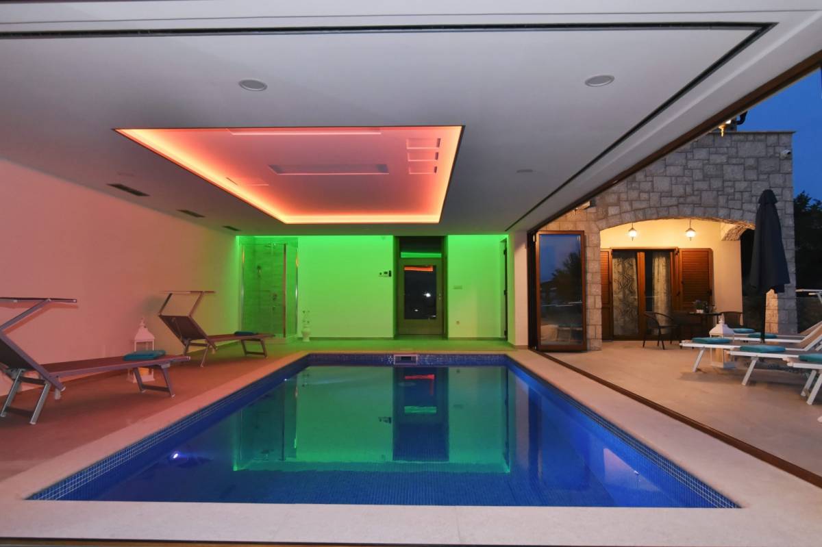 Vila se prostire na 350 m² i sastoji se od tri etaže, pažljivo osmišljenih kako bi zadovoljile sve zahtjeve modernog života. U prizemlju se nalazi odvojena kuhinja opremljena visokokvalitetnim uređajima i namještajem, povezana s blagovaonicom iz koje se izlazi na unutarnji grijani bazen. Prostor bazena dodatno je opremljen posebnom ambijentalnom rasvjetom, tušem i zasebnim WC-om, što osigurava maksimalnu udobnost i luksuzan doživljaj. Na ovoj etaži smješten je i dnevni boravak te spavaća soba s vlastitom kupaonicom.