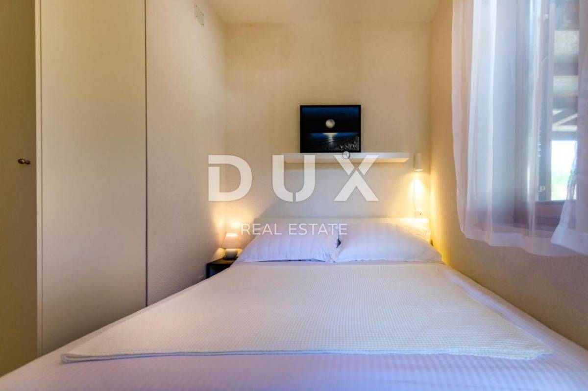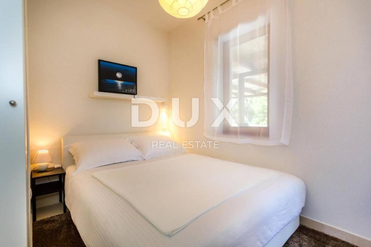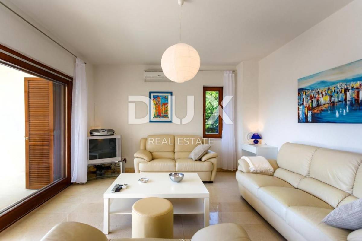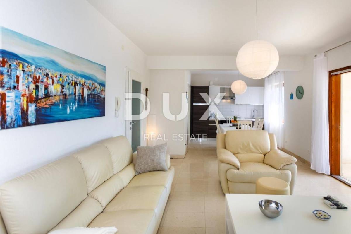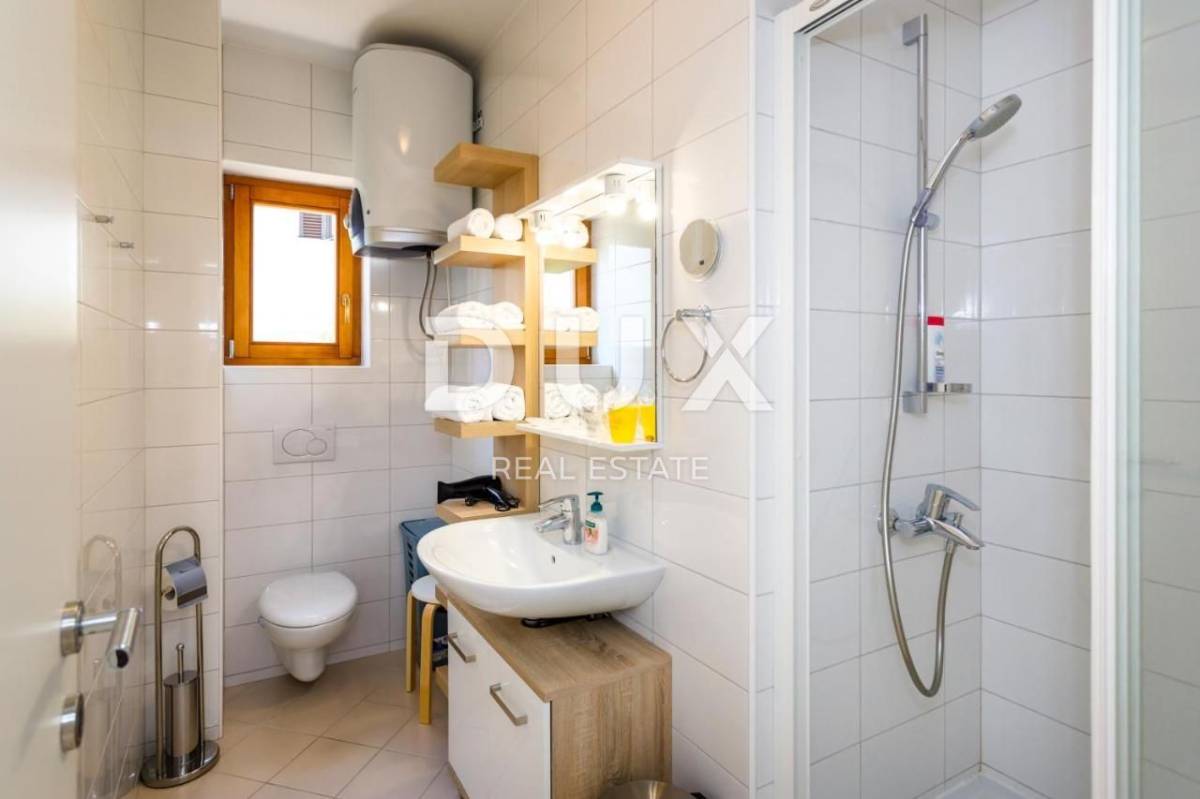 Apartman trosobni s dnevnim boravkom na izuzetnoj lokaciji PRVI RED DO MORA. Kuća se nalazi prvi red do mora, odmah iznad plaže, na mirnoj lokaciji, okruženoj zelenilom. Sastoji se od dve spavaće sobe, dve kupaonice, dnevnog boravka, kuhinje i blagovaone, te velike terase s pogledom na more. Izrazita rijetkost na tržištu! Apartman je potpuno nov, građen modernim tehnikama gradnje i opremljen kvalitetnom keramikom i stolarijom. Ima podno grijanje u svim prostorijama, TV, opremljenu kuhinju s perilicom posuđa i pećnicom te 2 kupaonice s kadom ili tušem.