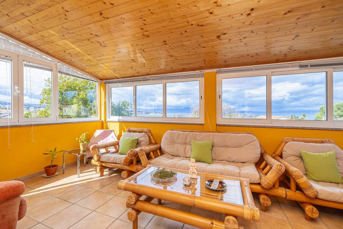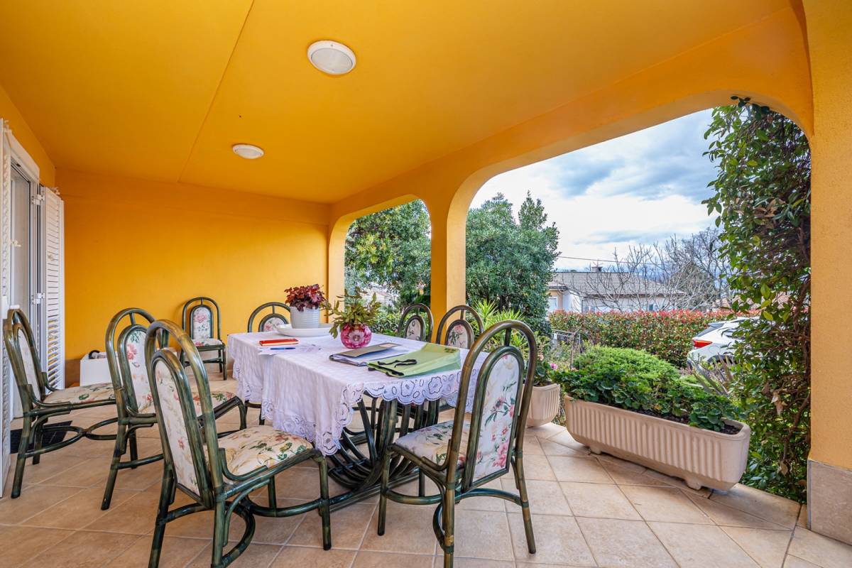 Posebna prednost ove nekretnine su prostrane terase. Gornja terasa pruža panoramski pogled na more, dok se s prednje strane kuće nalazi terasa okružena pažljivo uređenim vrtom s palmama. U stražnjem dijelu smještena je još jedna terasa s roštiljem, idealna za opuštanje i druženje.