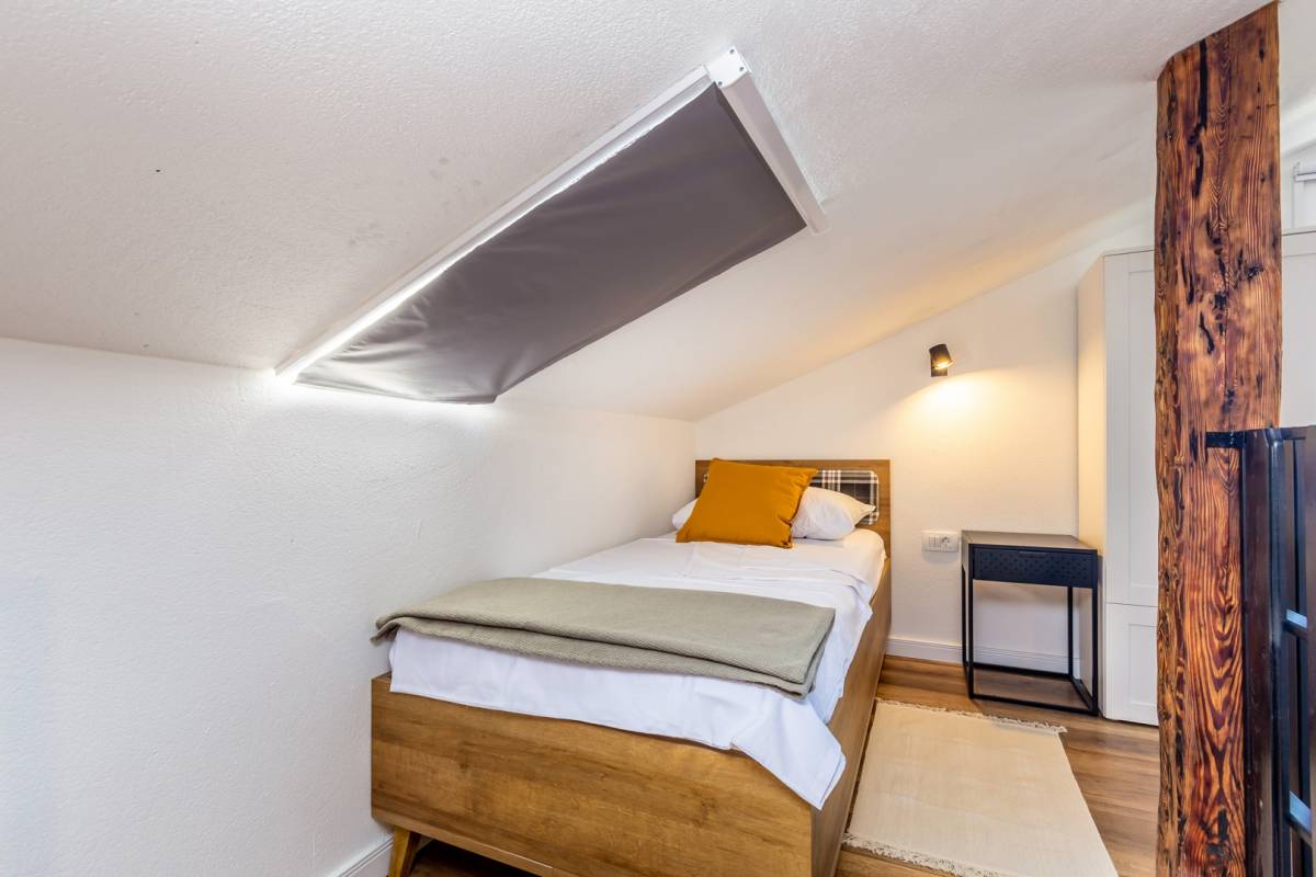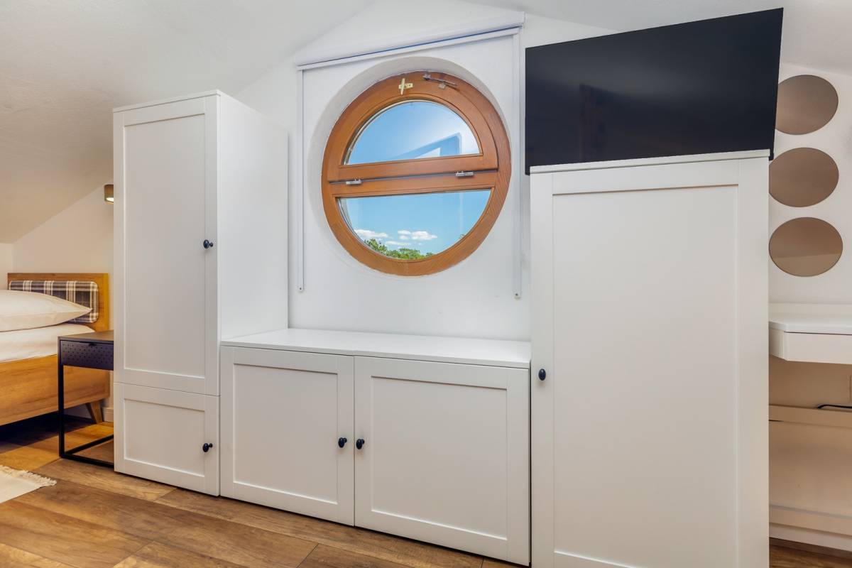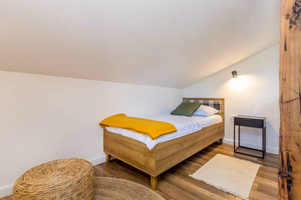 U prizemlju se nalazi dnevni boravak, kupaonica, kuhinja s blagovaonicom s izlazom na terasu i sunčalište. Na prvom katu nalaze se dvije spavaće sobe s bračnim krevetima i kupaonica. Na drugom katu odnosno galeriji nalazi se otvoreni prostor s dva odvojena kreveta (200 x 90).